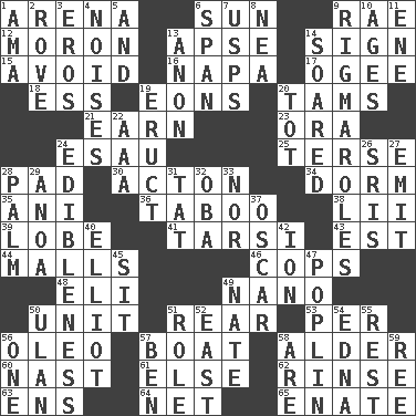 ACROSS 1. Sports stadium 6. Player for Phoenix 9. Actress Charlotte 12. Person of subnormal intelligence 13. Domed church section 14. Attach a signature 15. Shun 16. California wine valley 17. Double curve, resembling the letter S 18. Double-curved letter 19. Immeasurably long periods of time 20. Scottish caps 21. Merit 23. Mouth or opening 24. He sold his birthright 25. Laconic 28. Writing tablet 30. 13-14th century defensive garment 34. Dormintory (informal) 35. Black tropical American cuckoo 36. Off limits 38. Cards in a Roman deck? 39. Ear part 41. Tarsus (plural) 43. Eastern Standard Time (abbr.) 44. Promenades 46. 911 reaches them 48. Connecticut Ivy Leaguer 49. Billionth: prefix 50. A single undivided whole 51. Stern 53. For each 56. Margarine 57. Water vessel 58. Tree or shrub in the Birch family 60. Political cartoonist Thomas 61. Otherwise 62. Remove soap 63. Followers of ems 64. Fish or hair follower 65. Related on the mother's side DOWN 1. Housemaid (var.) 2. Be footloose 3. Greek god of love 4. Annoying sounds 5. Plus 6. Connect, as a bridge 7. United States Postal Service (abbr.) 8. Teachers' org. 9. Complicated, petty procedures 10. Ripens 11. Compass dir. 13. Soon (poet.) 14. Flew 19. Spew [out] 20. Small child 22. Auto club (abbr.) 24. The property of being fit to eat 26. Indian titles of respect 27. Send forth 28. Inside of hand 29. Small Philippine buffalo 31. Make lace 32. Chief or king in Benin or Nigeria 33. Or not 37. Motion picture award 40. American author Paul (1891-1958) 42. Electrically charged atom 45. Be seated 47. Cotton for raincoats, e.g. 49. Nathan's nickname 50. Uhlan (variant) 51. Hero or heavy, e.g. 52. Compass direction 54. Pulitzer Prize-winning author Ferber 55. Respite 56. Single 57. Benjamin's nick name 58. "We ___ not amused" (Victoria) 59. To separate or throw off