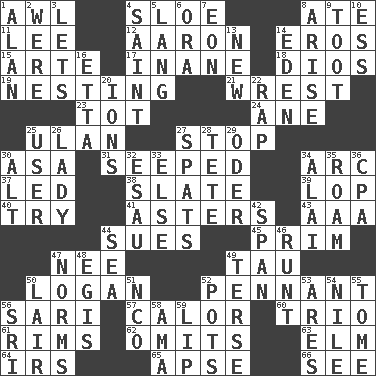 ACROSS 1. Leather borer 4. A type of plum 8. Had dinner 11. Area sheltered from the wind 12. Composer Copland 14. Greek god of love 15. Johnson of "Laugh-In" 17. Lacking in sense or substance 18. "Vaya con ____" 19. Inhabiting a nest 21. Obtain by seizing forcibly or violently 23. Small child 24. A saturated hydrocarbon 25. ____ Bator 27. Halt 30. White ___ sheet 31. Oozed 34. Curve 37. Directed 38. Chalkboard 39. Chop off 40. Attempt 41. Michaelmas daisies 43. American Automobile Association (abbr.) 44. Institutes legal proceedings 45. Demure 47. Born 49. The 19th letter of the Greek alphabet 50. Utah city north of Ogden 52. Pre-World Series prize 56. Indian skirt 57. Bodily heat indicating an inflammation 60. Musical group of three 61. Basketball hoops 62. Leaves out 63. Shade tree 64. Big collection agency 65. Domed church section 66. Perceive with the eye DOWN 1. ____ Jay Lerner 2. Past tense of be (plural) 3. Allows 4. Inhabitant of Heaven 5. Austrian-born American filmmaker Fritz 6. Mouth or opening 7. Period of immesurable duration 8. Originate 9. A blast of a horn 10. Double-curved letter 13. ___ Haven, CT 14. Paradise 16. Singer James 20. Charged particles 22. Strike 25. One who uses or employs something 26. Kenny Rogers chart-topper in '80 27. Arguments over trivial matters 28. False hair 29. Baltic tributary 30. The first octave above the treble staff 32. He sold his birthright 33. Otherwise 34. Jai _ 35. Wander 36. Tax preparer (abbr.) 42. Connect, as a bridge 44. Ocean 46. Undersized animal 47. Typical models 48. The front part of a cuirass 49. Laconic 50. Den 51. Non-commissioned officer (abbr.) 52. Cooking vessels 53. Ancient Greek god of war 54. The longest river in the world 55. Heavy book 56. _ Lanka 58. Nanny (var.) 59. Mouth edge