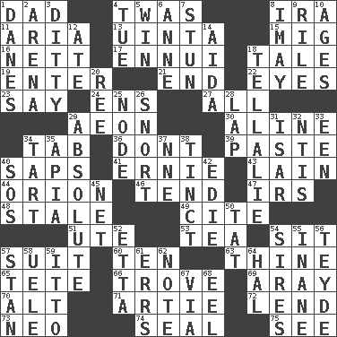 ACROSS 1. Male parent 4. It was, poetically 8. Lyricist Gershwin 11. Operatic vocal solo 13. National forest in Provo, Utah 15. Russian fighter aircraft 16. Remaining after all deductions 17. World-weariness 18. Story 19. Keyboard key 21. Conclude 22. Snake ____ (dice throw) 23. Declare 24. Followers of ems 27. 100% 29. Age 30. Place in a line 34. Keyboard key 36. Do not 39. Thick mixture 40. Plant excrements 41. Bert's buddy 43. (Had) reclined 44. Greek mythologigal hunter 46. Be inclined (to) 47. Big collection agency 48. Having lost freshness 49. Quote 51. Shoshoni 53. Afternoon social gathering 54. Be seated 57. Set of matching outer garments 60. Nine, plus one 63. One or ones belonging to thee 65. False hair 66. Collection of objects 69. Like ___ of sunshine 70. Keyboard modifier key 71. Nick name for Arthur 72. Grant temporary use of 73. Modern: prefix 74. Lick closed 75. Perceive with the eye DOWN 1. Natives or inhabitants of Denmark 2. Sports stadium 3. Short, simple song 4. Third day of the wk. 5. Acquire through effort 6. Queen of England 1702-14 7. Astound 8. "If ____ say so..." 9. Cause heat under the collar 10. Eras 12. Had dinner 14. Opera by Verdi 18. Copy Pinocchio 20. To riddle 25. Connecting point 26. Derisive sound 28. Infant locale 29. Utter; complete 31. Austrian river, tributary to the Danube 32. Nuclear Threat Initiatives 33. Car or cant ending 34. Small pie 35. Capital of Western Samoa 37. Compass dir. 38. Tinged 40. Distress signal 42. Singer Brickell 45. Fish or hair follower 50. Make lace 52. Singer James 54. Male parents of animals 55. Empty; void 56. Miss Universe 1986, Barbara Palacios _ 57. Comedian Laurel of Laurel & Hardy 58. Ubangi River tributary 59. "Tell ____ the Marines!" 61. Blunders 62. Observe 64. Actor Linden 67. By way of 68. Snakelike fish