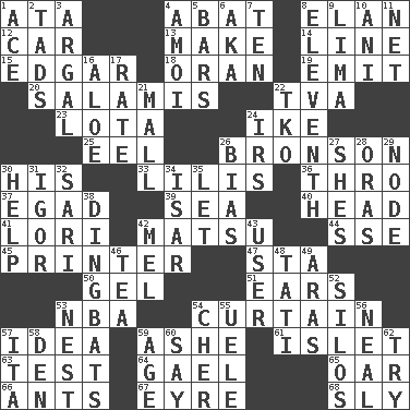 ACROSS 1. "One Day ___ Time" 4. Blind as ____ 8. Liveliness 12. 4-wheeled motor vehicle 13. Create 14. Actor's bit 15. _ Allan Poe 18. NW Algerian seaport 19. Give off 20. Deli grouping 22. Federal power corp. 23. Globular water bottle used in Asia 24. D.D.E's nickname 25. Snakelike fish 26. "Death Wish" actor 30. Part of HMS, perhaps 33. Ms. Damita and namesakes 36. Through, poetically 37. Mild oath 39. Ocean 40. Froth on beer 41. Australian parrot (variant) 42. Taiwanese island in East China Sea 44. Compass dir. 45. Hard copy producer 47. R.R. building 50. Set 51. Hearing organs 53. Basketball assoc. 54. Window treatment 57. It may be bright or harebrained 59. American tennis player Robert 61. Small island 63. Trial 64. Highlander 65. Rowing implement 66. Pismires 67. Jane of fiction 68. Secret DOWN 1. Adept person 2. Small boys 3. Therefore, facetiously 4. Mine, in Marseilles 5. Long, evenly shaped pieces 6. Alias (abbr.) 7. Nine, plus one 8. Veterans Day date 9. Pale green bean 10. Black tropical American cuckoo 11. Fish or hair follower 16. Medicinal plant 17. Pace 21. Promenade 22. Ring climax 24. Big collection agency 26. Prejudice 27. "______ My Girl" (Turtles hit) 28. Mouths or openings 29. Connecting point 30. Aid 31. Russian composer Stravinsky 32. Indian skirt 34. Austrian river, tributary to the Danube 35. Allow 38. Empty-headed or silly people 42. Cartoonist voice _ Blanc 43. One who makes use of a thing 46. Beverage made from leaves 48. Jacques of French films 49. Ancient river in northeast Turkey 52. Grain storage towers 53. Egg locale 54. "Mermaids" star 55. Ubangi River tributary 56. Actress Patricia 57. Call ___ day 58. Lair 59. Personal question 60. Declare 62. Attempt to accomplish something