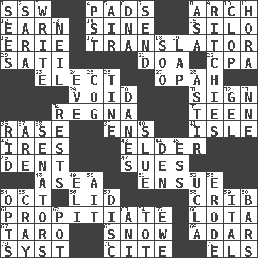 ACROSS 1. Compass dir. 4. Writing tablets 8. Bowlike part 12. Merit 14. Trig term 15. Grain storage tower 16. One of the Great Lakes 17. Interpreter 20. Suttee (variant) 21. ___ good deed 22. Accounting whiz (abbr.) 23. Voters do this 27. Brightly colored fish 29. Lacking any legal or binding force 31. Public display of a written message 34. Rain (Swedish) 35. Adolescent 36. To erase 39. Followers of ems 41. Small island 42. Angers 43. A person who is older than you are 46. Incision 47. Institutes legal proceedings 48. At sea 51. Take place subsequently 54. Sep. follower 56. Hat (slang) 58. Baby bed with high sides 61. Appease 66. Globular water bottle used in Asia 67. Pacific island yam 68. Overwhelm 69. The sixth month of the Jewish calendar 70. System (abbr.) 71. Quote 72. Raised railways DOWN 1. Perceives with the eye 2. "Two Mules for Sister ____" 3. Compose 4. Pacific Standard Time (abbr.) 5. Atmosphere 6. Heredity factor (abbr.) 7. Transmit 8. White ___ sheet 9. Actors Guy, Robert Welles, and Clint 10. Hoof sound 11. Israeli folk dance 13. Famous astronaut Armstrong 18. "Barney Miller" actor Jack 19. Infant locale 24. First lady 25. Gear tooth 26. Prong on a fork 28. Moving about 30. Natives or inhabitants of Denmark 32. Set 33. Compass dir. 34. Musical pauses 36. To free from 37. "We ___ not amused" (Victoria) 38. Legislators 40. Turn sharply 44. Lair 45. Curvy letter 49. Connecticut Ivy Leaguer 50. Small island 52. Southern CA. univ. 53. Wear away 54. Chooses 55. Supercomputer manufacturer 57. Flat circle 59. Slanted text style (abbr.) 60. Oblong pieces of solid material 62. Cooking vessel 63. Black tropical American cuckoo 64. Small child 65. She-sheep