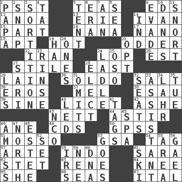 ACROSS 1. Inconspicuous attention getter 5. Beverages made from leaves 9. Begley and Asner 12. Small Philippine buffalo 13. One of the Great Lakes 14. "Terrible" tsar 15. Component 16. Grandmother 17. Billionth: prefix 18. Fitting 19. Being at a high temperature 21. More peculiar 22. SW Asia republic 24. Trim (branches) 26. Eastern Standard Time (abbr.) 27. Vertical member of a panel or frame 28. 90 degrees 29. (Had) reclined 30. Twentieth part of a lira 32. Table seasoning 36. Greek god of love 37. Cartoonist voice _ Blanc 38. He sold his birthright 39. Trig term 40. It is permitted: Lat. 42. American tennis player Robert 43. Remaining after all deductions 44. Being in motion 46. A saturated hydrocarbon 49. Music discs 50. Global Positioning Systems (abbr.) 51. With motion or animation 53. Girls' org. (abbr.) 54. Label 57. Johnson of "Laugh-In" 58. _ china 61. "Two Mules for Sister ____" 62. Proofreading order 63. French philosopher Descartes 64. Leg joint 65. A female animal or person 66. Oceans 67. Slanted text style (abbr.) DOWN 1. Dad 2. Fastener 3. Drawing lots 4. Make lace 5. Portable shelter 6. Period 7. The 18th letter of the Arabic alphabet 8. Ocean 9. Dodge 10. Natives or inhabitants of Denmark 11. Derisive sound 14. Working for oneself (abbr.) 19. Actor Linden 20. Washington bills 21. Elect 23. Remove soap 24. Dipping utensil 25. Bear (Spanish) 27. Indian skirt 28. Opt 29. French article 31. Leaves out 32. Theater features 33. Aide 34. Cowardly lion portrayer 35. Third day of the wk. 40. Directed 41. Labels 43. Non-commissioned officer (abbr.) 45. Health resort 46. Collect or gather 47. Compass direction 48. First name in cosmetics 52. Put into a specified state 53. Leaves 55. Type of rug 56. Highlander 58. Big collection agency 59. Born 60. Heredity factor (abbr.) 61. What Jean-Claude Killy likes to do