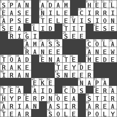 ACROSS 1. Connect, as a bridge 5. First of billions? 9. Person who is morally reprehensible 13. Relaxation 14. "Death on the ____" 15. High-altitude cloud 16. Domed church section 17. Boob tube 19. Ocean 20. Flaplike covering 21. Teat (slang) 22. Compass dir. 23. Swiss mountan, "Queen of the Mountains" 25. Perceive with the eye 26. Collect or gather 30. Root beer relative 34. The wife of a rajah (variant) 35. Afresh 36. Frog relative 39. Related on the mother's side 42. Ancient Persian 43. Libertine 44. Miss Universe 1986, Barbara Palacios _ 46. SW Asia republic 47. Scornful expression 48. Supplement with great effort 51. California wine valley 54. Afternoon social gathering 57. Assist 58. Music discs 60. Period 62. Abnormally rapid or deep breathing 65. Use a swizzle stick 66. Believer in; advocate of (suffix) 67. SW Saudi Arabia district 68. Type of rug 69. Separate forcefully 70. Flatfish 71. Many (prefix) DOWN 1. Oceans 2. Some stationery 3. Slender Brazilian palm 4. Born 5. Opposed to 6. Passed on 7. Everything 8. Confronts 9. Part of HMS, perhaps 10. 4th largest of the Great Lakes 11. Greek god of love 12. Actor's bit 15. Quote 18. Compete 20. Pale green bean 24. Place where plants grow 27. One (Scot) 28. Elected rep. 29. Theater features 30. Device for capturing images 31. Single 32. Directed 33. Deep reverence 36. Three (prefix) 37. Rowing implement 38. Alias (abbr.) 40. "___ Little Indians" 41. Sight organ 45. Hiding places for outlaws 48. Merit 49. Monetary unit of Laos 50. Ferber et al. 52. Stone: prefix 53. Satellite of Uranus 54. Not this but _ 55. Jane of fiction 56. Capital of Western Samoa 58. To provide with a ceiling 59. Have the gumption 61. Like ___ of sunshine 63. Ewer handle 64. Bear (Spanish) 65. Plant excrement