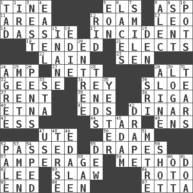 ACROSS 1. Prong on a fork 5. Raised railways 8. Viper 11. Length times width 12. Wander aimlessly 13. Lion 14. Small ungulate mammals of Africa 17. Event 19. Watched over 21. Chooses 22. (Had) reclined 23. Elected rep. 24. Electrical Unit 27. Remaining after all deductions 29. Keyboard modifier key 32. Honkers 34. Marina Del _, California 36. A type of plum 37. Monthly bill 38. Compass dir. 39. Port city in Latvia 40. Inactive volcano in Sicily 41. Begley and Asner 42. Middle Eastern gold or silver currency 43. Curvy letter 44. Play the lead 46. Followers of ems 47. Shoshoni 50. Dutch treat 52. Went by 55. Window treatments 57. Electrical Measurement 59. Mode 62. Area sheltered from the wind 63. Cole _ (cabbage dish) 64. Printing process, for short 65. Conclude 66. Car or cant ending 67. Singer James DOWN 1. Bit 2. Lyricist Gershwin 3. A home for chicks 4. Artist's stand 5. Period of immesurable duration 6. Shoestrings 7. Grin 8. Actor Baldwin 9. Emitted 10. Plant holders 12. To free from 15. Lacking in sense or substance 16. Singer Brickell 18. Lair 20. Main course 24. Match 25. Confronts 26. Actor Sean's family 28. Watches over 29. Place in a line 30. Utah city north of Ogden 31. Pulls into pieces 33. R.R. building 35. Of or pertaining to yesterday 36. Indian title of respect (Mr.) 42. Window treatment 45. First man 47. Purpose 48. Laconic 49. Peak District village in England 51. Distance measurement (Brit.) 52. Light colored 53. So be it 54. Broke a traffic law 55. Morning condensation 56. Attempt 58. Separate the seeds from cotton 60. Baseball player Mel 61. ___ good deed