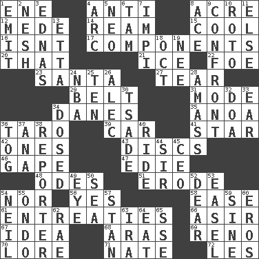 ACROSS 1. Compass dir. 4. Against 8. Land measure 12. Ancient Persian 14. 480, 500 or 516 sheets of paper 15. Calm and collected 16. Is not 17. Pieces 20. Not this but _ 21. Frozen water 22. Enemy 23. Before Barbara or Clara 27. Rend 29. Waist strap 31. Method 34. Natives or inhabitants of Denmark 35. Small Philippine buffalo 36. Pacific island yam 39. Automobile 41. Play the lead 42. Washington bills 43. Flat circles 46. Yawn 47. Singer Brickell 48. Lyric poems 51. Wear away 54. Or not 56. It is so 58. Comfort 61. Pleas 66. SW Saudi Arabia district 67. The main thing one is thinking about 68. Caspian sea tributary 69. Former U.S. Attorney General Janet 70. Old wives' tales, e.g. 71. Nathan's nickname 72. French article DOWN 1. Send forth 2. Delicate 3. Ferber et al. 4. Curve 5. Modern: prefix 6. Scottish cap 7. Body of Kaffir warriors 8. Adept person 9. Meet 10. Printing process, for short 11. Otherwise 13. Singer James 18. Sep. follower 19. Born 24. Basketball assoc. 25. "___ Little Indians" 26. Actor Baldwin 28. Collect or gather 30. Sadhe (variant) 32. ___ good deed 33. Hearing organ 34. Administered medicine 36. Coat; cloak 37. Santa ___, CA 38. Newsperson 40. Travel on or in a vehicle 44. Title for a knight 45. Corporate head (abbr.) 49. Sight organ 50. Ocean 52. Letter starter 53. Artist's stand 54. Famous astronaut Armstrong 55. Southwest Nigerian state 57. Comedian Laurel of Laurel & Hardy 59. Trig term 60. Greek god of love 62. Actress Charlotte 63. Retirement account (abbr.) 64. Ingest 65. Compass dir.