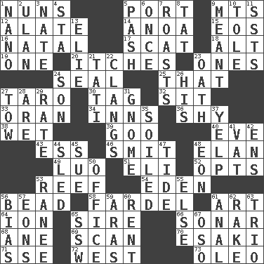 ACROSS 1. Religious women 5. Left side of a ship or aircraft 9. Mountains (abbr.) 12. Having winglike extensions 14. Small Philippine buffalo 15. Greek goddess of the dawn 16. Relating to or accompanying birth 17. Leave at once 18. The first octave above the treble staff 19. Single 20. Skin irritations 23. Singles 24. Lick closed 25. Not this but _ 27. Edible starchy tuberous root 30. Label 32. Be seated 33. Northwest Algerian city 34. Restaurants 36. Like a shrinking violet 38. Soggy 39. Thick or sticky substance 40. Night before a holiday 43. Double-curved letter 46. Stricken, poetically 48. Style 49. Nilotic language 51. Connecticut Ivy Leaguer 52. Elects 53. Coral ridge 54. Locale of original sin 56. Necklace unit 58. Burden 61. Nonscientific branch of learning 64. Electrically charged atom 65. Male parent of an animal 66. Echolocation 68. One (Scot) 69. Examine hastily 70. 1973 Nobel Price Winner (Physics) Leo 71. Compass dir. 72. Compass direction 73. Margarine DOWN 1. Billionth: prefix 2. Uhlan (variant) 3. Nathan's nickname 4. R.R. building 5. Romantic infatuation 6. Single time 7. Ridicules or criticizes harshly 8. Make lace 9. Intended 10. Lacquered or enameled metalware 11. Fast planes 13. Writer Wiesel 21. Jacques of French films 22. Rigngs loudly 23. Pledge 24. Boy, to dad 26. Part of HMS, perhaps 27. Pull behind 28. "We ___ not amused" (Victoria) 29. Pace 31. Dwarf 35. Dirtied 37. Sharp bark 41. Large container 42. Followers of ems 44. Downhill vehicle 45. Institute legal proceedings 47. Event that recurs at intervals 48. Age 50. Public position 53. Indian princess (variant) 55. Otherwise 56. Prejudice 57. Immeasurably long periods of time 59. Caspian sea tributary 60. Monthly bill 61. Of or related to the anus 62. Immoral or dissolute person 63. Musical group of three 65. Compass dir. 67. Bear (Spanish)