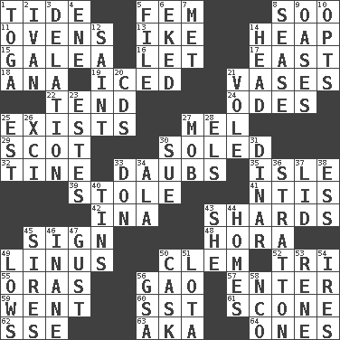 ACROSS 1. Periodic rise and fall of the sea level 5. Opposite of masc. 8. "Barney Miller" actor Jack 11. Baking chambers 13. D.D.E's nickname 14. Pile 15. An organ shaped like a helmet 16. Allow 17. Compass direction 18. Santa ___, CA 19. On the rocks 21. Flower holders 22. Be inclined (to) 24. Lyric poems 25. Is 27. Cartoonist voice _ Blanc 29. Highlander 30. Having a sole or soles 32. Prong on a fork 33. Applies to a surface 35. Capri or Wight 39. Took without asking 41. Nuclear Threat Initiatives 42. _ tizzy (2 wds.) 43. Broken pieces 45. Attach a signature 48. Israeli folk dance 49. "_ and Lucy" (Charlie Brown theme song) 50. Clement's nick name 52. Three (prefix) 55. Mouths or openings 56. E Mali city 57. Keyboard key 59. Left 60. Fast jet (abbr.) 61. Biscuitlike quick bread 62. Compass dir. 63. Alias (abbr.) 64. Singles DOWN 1. Ancient Roman robe 2. "Terrible" tsar 3. Accusation by an informer 4. Compass dir. 5. Do some clerical work 6. Made supply last 7. Was introduced to 8. Gospel singer Marvin 9. Fertile tracts in a desert 10. Chooses 12. Inhabitant of Heaven 14. Froth on beer 20. Music discs 21. Short-tailed, large-bodied rat 23. _____ Park, CO 25. Eastern Standard Time (abbr.) 26. One more than ninety 27. Crowd into 28. Raised railways 30. Take to court 31. Middle Eastern gold or silver currency 33. Spanish title 34. Insect wing 36. Ski resort town in Vermont 37. Hat (slang) 38. Double-curved letter 40. Metal containers 43. A female animal or person 44. Residences 45. Titles for men of rank and authority 46. Silly 47. Abrupt rush of wind 49. Moos 50. Keg 51. Globular water bottle used in Asia 53. French philosopher Descartes 54. Angers 56. Girls' org. (abbr.) 58. Non-commissioned officer (abbr.)