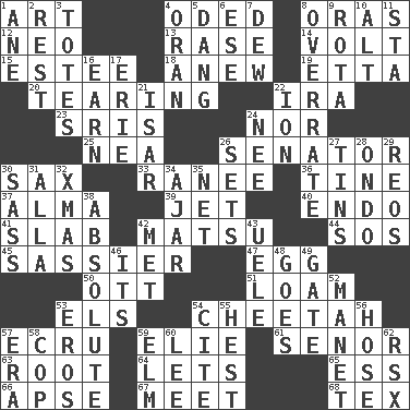 ACROSS 1. Nonscientific branch of learning 4. Wrote a lyric poem 8. Mouths or openings 12. Modern: prefix 13. Raze (variant) 14. Electrical Unit 15. First name in cosmetics 18. Afresh 19. Singer James 20. Pulling apart 22. Lyricist Gershwin 23. Indian titles of respect 24. Or not 25. Teachers' org. 26. Elected representative 30. Saxophone 33. Indian princess (variant) 36. Prong on a fork 37. _ mater 39. _ stream 40. Inside; within (prefix) 41. Broad, flat, thick piece 42. Taiwanese island in East China Sea 44. Distress signal 45. More lively and spirited 47. Ovum 50. Baseball player Mel 51. Rich soil 53. Raised railways 54. Leopard's kin 57. Shade of tan 59. Writer Wiesel 61. Sir (Sp.) 63. Carrot, for example 64. Allows 65. Curvy letter 66. Domed church section 67. Confront 68. John Ritter's dad DOWN 1. One (Scot) 2. Respite 3. Hauls 4. NW Algerian seaport 5. Mild oath, euphamism for damn 6. Compass dir. 7. Morning condensation 8. Make much ado about nothing 9. Round or rotation of duties 10. Keyboard modifier key 11. R.R. building 16. Merit 17. One of the Great Lakes 21. Austrian river, tributary to the Danube 22. Electrically charged atom 24. Born 26. Arranges properly for use 27. Metal containers 28. Southwest Nigerian state 29. Vintage cars 30. Backtalk 31. Silent film actress Nazimova 32. Dec. holiday 34. Partly open 35. Fish or hair follower 38. Utter; complete 42. Was introduced to 43. Ubangi River tributary 46. It is 48. Travels 49. Yard entry 52. French painter Edouard 53. Greek god of love 54. Quote 55. Command 56. Flexible conduit 57. Epoch 58. Police officer (slang) 59. Shade tree 60. Area sheltered from the wind 62. Acura sports coupe
