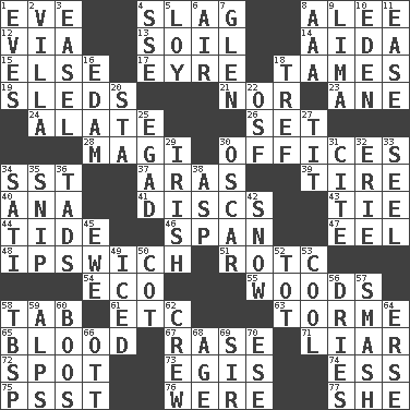ACROSS 1. First lady 4. Volcanic refuse 8. Toward shelter 12. By way of 13. Earth 14. Opera by Verdi 15. Otherwise 17. Jane of fiction 18. Softens 19. Bobsleighs 21. Not either 23. One (Scot) 24. Having winglike extensions 26. Arrange properly for use 28. Wise men 30. Positions of authority 34. Fast jet (abbr.) 37. Ancient river in northeast Turkey 39. Hoop that covers a wheel 40. Santa ___, CA 41. Plates 43. Standoff 44. Periodic rise and fall of the sea level 46. Connect, as a bridge 47. Snakelike fish 48. NE Massachusetts town 51. College mil. group 54. Environmental prefix 55. Forest 58. Bar bill 61. And so on (abbr.) 63. Singer Mel 65. Vital fluid 67. To erase 71. One who doesn't tell the truth 72. Specific locale 73. The front part of a cuirass 74. Curvy letter 75. Inconspicuous attention getter 76. Past tense of be (plural) 77. A female animal or person DOWN 1. Nights before holidays 2. Country estate 3. Artist's stand 4. Compass dir. 5. Myrna of the movies 6. Atmosphere 7. Small, secluded valley 8. Auto club (abbr.) 9. Pale green bean 10. Locale of original sin 11. Relaxation 16. Dutch treat 18. Unclean, religiously 20. R.R. building 22. Order of Saint Francis (abbr.) 25. Mild oath 27. Teat (slang) 29. From or relating to Ireland 30. Motion picture award 31. Quote 32. 4th largest of the Great Lakes 33. Sew up the eyelids of hawks and falcons 34. Suttee (variant) 35. Clip 36. Small amounts or degrees 38. Cleo's killer 42. Frozen precipitation 45. She-sheep 49. On the rocks 50. Small bed 52. Small child 53. Calm and collected 56. Frees from moisture 57. Box-office sellout 58. Cook's measure (abbr.) 59. High mountains 60. Scornful sounds 62. Group working together 64. Celtic language 66. Baseball player Mel 68. Mature 69. Title for a knight 70. Compass dir.