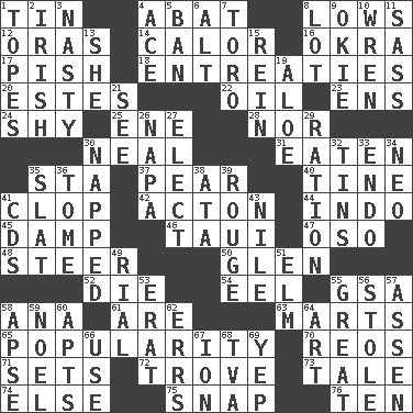 ACROSS 1. Metal container 4. Blind as ____ 8. Coldest temperatures 12. Mouths or openings 14. Bodily heat indicating an inflammation 16. Gumbo ingredient 17. Expression of disdain 18. Pleas 20. _____ Park, CO 22. Lubricate 23. Followers of ems 24. Like a shrinking violet 25. Compass dir. 28. And not 30. Anneal 31. Ingested 35. R.R. building 37. Lightbulb-shaped fruit 40. Prong on a fork 41. Hoof sound 42. 13-14th century defensive garment 44. Southeast Asian peninsula 45. Moist 46. "Change" in Tahitian 47. Bear (Spanish) 48. Bull 50. Small, secluded valley 52. Pass on 54. Snakelike fish 55. Girls' org. (abbr.) 58. Santa ___, CA 61. "We ___ not amused" (Victoria) 63. Shops 65. Teen's desire 70. Vintage cars 71. Puts into a specified state 72. Collection of objects 73. Falsehood 74. Otherwise 75. Fastener 76. "___ Little Indians" DOWN 1. Drinks excessively 2. From or relating to Ireland 3. Difficult 4. Adept person 5. Bar 6. The first octave above the treble staff 7. "Corrida" creature 8. Car dealer's back yard 9. Migrant worker of the '30s 10. Songbird 11. Backtalk 13. A female animal or person 15. It's straight from the horse's mouth 19. _ vera 21. Perceive with the eye 26. California wine valley 27. Voters do this 29. Food allowance for one day 30. Slept 32. Metal containers 33. Inside; within (prefix) 34. Modern: prefix 35. Narrow board 36. Heavy book 38. "One Day ___ Time" 39. Makeup applied to the cheeks 41. Music discs 43. "Death on the ____" 49. Monetary unit of Yemen 51. Shade tree 53. Part of Q.E.F. 55. Relatively large 56. Took without asking 57. NE Netherlands city 58. Domed church section 59. Christmas carol 60. Tenement units (abbr.) 62. Blunders 64. Tate display 66. Purpose 67. Electrically charged atom 68. Federal power corp. 69. Slangy assent