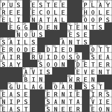 ACROSS 1. Suppuration 4. First name in cosmetics 9. Shaw product 13. To separate or throw off 14. Learning spot: Fr. 15. Hollow 16. Biblical high priest 17. Brizilian seaport 18. I made a mistake 19. Oval reproductive body of a fowl 21. Lair 22. Portable shelters 24. Horse sense 26. Compass dir. 27. Travel by water 29. Pismires 30. Wear away 31. Passed on 33. Baseball player Mel 36. Atmosphere 37. Noisy, rowdy, vocal (Spanish) 40. Ocean 41. Declare 42. Within a short period 43. Prevent from occurring 45. Opinion 47. Happening 48. Storage container 49. Songbird 50. Russian prison camp 52. Rowing implement 54. Fast jet (abbr.) 56. Relaxation 57. Bert's buddy 59. Big collection agency 61. Cuts off 62. Before Barbara or Clara 63. Compete 64. 90 degrees 65. Scornful expression 66. Period of immesurable duration DOWN 1. Before (prefix) 2. Ubangi River tributary 3. Signiory (variant) 4. Car or cant ending 5. Oodles 6. Lug 7. Liveliness 8. Snakelike fish 9. Gives a jingle 10. Plunder 11. High mountains 12. Consenting reply 20. Gilt 22. Is inclined (to) 23. Eastern Standard Time (abbr.) 25. One who uses or employs something 27. Oceans 28. Roberta Peters solo 29. A really long time 31. "Vaya con ____" 32. Wedding promise 33. Clearly or manifestly demonstrative 34. Adolescent 35. Small pie 38. Exploiting 39. Baltic tributary 44. Nights before holidays 45. Most capable 46. By way of 49. Compose 50. Greek goddess of the earth (variant) 51. United States Postal Service (abbr.) 52. Northwest Algerian city 53. Singer Murray 55. Musical group of three 56. Compass dir. 57. Curvy letter 58. Hearing organ 60. Elected rep.