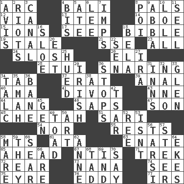ACROSS 1. Curve 4. Indonesian resort city 8. Friends 12. By way of 13. A distinct part 14. Mitch Miller's instrument 15. Charged particles 17. Ooze 18. The Good Book 19. Having lost freshness 21. Compass dir. 23. 100% 24. Agitate, as a liquid 26. Biblical high priest 28. Needle case 30. Catching in a trap 34. Bar bill 37. Part of Q.E.F. 39. Of or related to the anus 40. Nanny (var.) 41. A piece of turf (Scot.) 43. Compass dir. 44. Austrian-born American filmmaker Fritz 46. Plant excrements 47. Boy, to dad 48. Leopard's kin 51. Indian skirt 54. Or not 55. Musical pauses 58. Mountains (abbr.) 61. "One Day ___ Time" 63. Maternal 65. Having the leading position 67. Nuclear Threat Initiatives 71. Long journey 72. Located in or toward the back 73. Grandmother 74. Observe 75. Jane of fiction 76. Whirlpool 77. Big collection agency DOWN 1. Advice 2. Debaucheries 3. Lessep's creation 4. Twice 5. Had dinner 6. Area sheltered from the wind 7. Naughty children 8. Luau course 9. Swedish rock group 10. Hang loosely or laxly 11. Stitch closed the eyes of (a falcon) 16. A type of plum 18. Actor Lugosi 20. Eastern Standard Time (abbr.) 22. Elected rep. 25. Took on color 27. Lyricist Gershwin 29. From or relating to Ireland 30. Closes up, plugs up 31. Taverns 32. Billionth: prefix 33. Small, secluded valley 34. Baby powder 35. Nursemaid 36. Object of repulsion 38. Actress Gardner 42. Russian ruler of old 45. Commissioned mil. rank 49. Frog relative 50. Nonscientific branch of learning 52. To separate or throw off 53. Is not 56. Tarsus (plural) 57. Guide 58. Female horse 59. Those things 60. Scorch 62. Singer Murray 64. Supplements with great effort 66. "We ___ not amused" (Victoria) 68. Small boy 69. Indiana (abbr.) 70. Declare