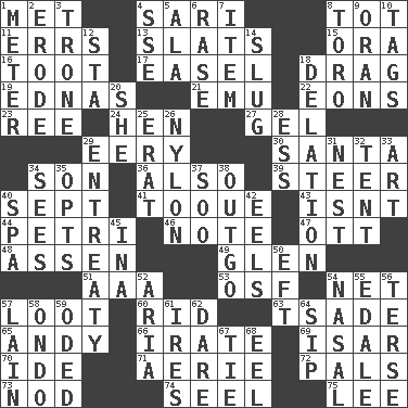ACROSS 1. Was introduced to 4. Indian skirt 8. Small child 11. Blunders 13. Narrow boards 15. Mouth or opening 16. A blast of a horn 17. Artist's stand 18. To be drawn or hauled along 19. Ferber et al. 21. Australian flightless bird 22. Immeasurably long periods of time 23. To riddle 24. Layer 27. Set 29. Suggestive of the supernatural 30. Before Barbara or Clara 34. Male child 36. In addition 39. Guide 40. Back-to-school mo. 41. Woman's close-fitting hat 43. Is not 44. _ dish (used to culture cells) 46. Make mention of 47. Baseball player Mel 48. NE Netherlands city 49. Small, secluded valley 51. Auto club (abbr.) 53. Order of Saint Francis (abbr.) 54. Fish or hair follower 57. Plunder 60. To free from 63. Sadhe (variant) 65. Actor Griffith 66. Feeling or showing extreme anger 69. Austrian river, tributary to the Danube 70. Binary compound 71. Nest on high 72. Friends 73. Lower and raise head in agreement 74. Stitch closed the eyes of (a falcon) 75. Area sheltered from the wind DOWN 1. Distance measurement 2. Eat (away) 3. Heavy duty weighing machine 4. Compass dir. 5. Chicken ___ king 6. To erase 7. A distinct part 8. "Corrida" creature 9. NW Algerian seaport 10. Labels 12. R.R. building 14. Strike heavily 18. Accusation by an informer 20. A female animal or person 25. Part of Q.E.F. 26. High-strength synthetic material 28. Double-curved letter 29. Plea 31. A home for chicks 32. Portable shelter 33. Nonscientific branch of learning 34. Observes 35. Elects 37. "Barney Miller" actor Jack 38. Outlay 40. Health resort 42. Snakelike fish 45. _ tizzy (2 wds.) 50. Lizard (obsolete) 52. Roberta Peters solo 54. Rhinal 55. Peak District village in England 56. Laconic 57. (Had) reclined 58. Southwest Nigerian state 59. Wrote a lyric poem 61. Angers 62. Have the gumption 64. Small drink 67. Make a knot 68. Snakelike fish