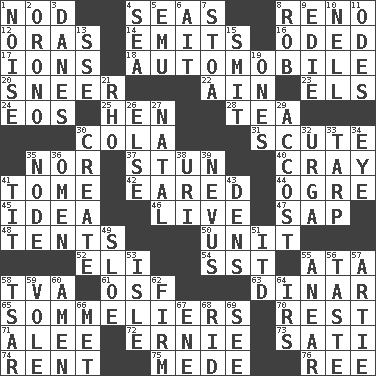 ACROSS 1. Lower and raise head in agreement 4. Oceans 8. Western Nevada city 12. Mouths or openings 14. Sends forth 16. Wrote a lyric poem 17. Charged particles 18. Form of transportation 20. Contemptuous expression 22. The 18th letter of the Arabic alphabet 23. Raised railways 24. Greek goddess of the dawn 25. Layer 28. Beverage made from leaves 30. Root beer relative 31. Turtle shell scale 35. Not either 37. Make senseless or dizzy 40. Supercomputer manufacturer 41. Heavy book 42. Having ears or earlike features 44. Legendary monster 45. The main thing one is thinking about 46. Moving, as bait 47. Plant excrement 48. Portable shelters 50. A single undivided whole 52. Biblical high priest 54. Fast jet (abbr.) 55. _ moment's notice (2 wds.) 58. Federal power corp. 61. Order of Saint Francis (abbr.) 63. Middle Eastern gold or silver currency 65. Wine waiters 70. Take ten 71. Toward shelter 72. Bert's buddy 73. Suttee (variant) 74. Monthly bill 75. Ancient Persian 76. Portuguese money of account (variant) DOWN 1. Annoying sound 2. U. of Maine site 3. Natives or inhabitants of Denmark 4. Ocean 5. Australian flightless bird 6. Small island 7. Portico 8. Director Reiner 9. Singer Brickell 10. 1994 drama film starring Jodie Foster 11. Lyric poems 13. Compass dir. 15. Stricken, poetically 19. Washington bills 21. 17th letter of the Greek alphabet 26. Otherwise 27. Relating to or accompanying birth 29. Buttonhole 30. Make 32. Capital and largest city of Mongolia 33. Canvas cover 34. Sight organ 35. Thickened enlargement 36. Presage 38. RI univ. 39. Mole, birthmark 41. Teat (slang) 43. Cub Scout units 49. A type of plum 51. It would 53. Small island 55. Approach 56. Clothes sense 57. Nick name for Arthur 58. Russian ruler of old 59. Grand slam 60. So be it 62. Become taut 64. Big collection agency 66. Was introduced to 67. Compass dir. 68. To free from 69. Perceive with the eye