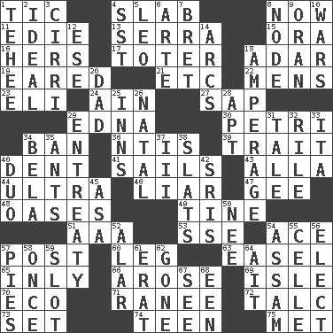 ACROSS 1. Nervous spasm 4. Thick slice 8. Immediately 11. Singer Brickell 13. Father Junipero _ 15. Mouth or opening 16. Possessive pronoun 17. Carrier 18. The sixth month of the Jewish calendar 19. Having ears or earlike features 21. And so on (abbr.) 22. Not women's 23. Connecticut Ivy Leaguer 24. The 18th letter of the Arabic alphabet 27. Plant excrement 29. Pulitzer Prize-winning author Ferber 30. _ dish (used to culture cells) 34. Forbid 36. Nuclear Threat Initiatives 39. Distinguishing feature 40. Gouge 41. Travel by water 43. Silent film actress Nazimova 44. Extremist 46. One who doesn't tell the truth 47. Turn to the right 48. Fertile tracts in a desert 49. Prong on a fork 51. Auto club (abbr.) 53. Compass dir. 54. Adept person 57. Mail 60. Part of a journey 63. Artist's stand 65. In an inward manner 66. Came up 69. Small island 70. Environmental prefix 71. The wife of a rajah (variant) 72. Baby powder 73. Arrange properly for use 74. Adolescent 75. Was introduced to DOWN 1. Giggle 2. Standard of perfection 3. High-altitude cloud 4. Fast jet (abbr.) 5. Lion 6. Johnson of "Laugh-In" 7. Cy Young winner Saberhagen 8. Connecting point 9. Northwest Algerian city 10. Armed conflicts 12. Compass dir. 14. Curves 18. Electrical Measurement 20. Male parent 25. Restaurants 26. Relating to or accompanying birth 28. Fitting 29. Plea 31. Falsehood 32. Cause heat under the collar 33. Call ___ day 34. Actor Lugosi 35. Pismires 37. One more than two 38. Narrow boards 40. Superhero pair 42. Indian titles of respect 45. White ___ sheet 50. Born 52. Having or resembling wings 54. Indian state 55. Cell (Danish) 56. Opt 57. Sliced desserts 58. At one time in the past 59. Slit 61. Part of Q.E.F. 62. Went 64. Small island 67. Perceive with the eye 68. Car or cant ending