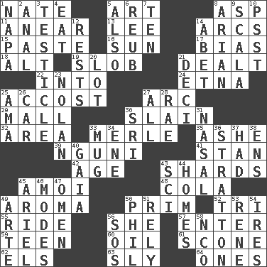 ACROSS 1. Nathan's nickname 5. Tate display 8. Cleo's killer 11. Approach 13. Area sheltered from the wind 14. Curves 15. Thick mixture 16. Player for Phoenix 17. Prejudice 18. The first octave above the treble staff 19. Messy guy 21. Started a card game 22. To the inside or interior of 24. Inactive volcano in Sicily 25. Buttonhole 27. Curve 29. Promenade 30. Killed 32. Length times width 33. Haggard of country music 35. American tennis player Robert 39. Group of southern Bantu languages 41. Comedian Laurel of Laurel & Hardy 42. Mature 43. Pottery fragments 45. Mine, in Marseilles 48. Root beer relative 49. Scent 50. Demure 52. Three (prefix) 55. Travel on or in a vehicle 56. A female animal or person 57. Keyboard key 59. Adolescent 60. Petroleum 61. Biscuitlike quick bread 62. Raised railways 63. Wily 64. Washington bills DOWN 1. California wine valley 2. Of or related to the anus 3. One of the two male reproductive glands 4. Erode 5. In addition 6. Reuben's nickname 7. Nine, plus one 8. Believer in; advocate of (suffix) 9. Any of the three canals of the cochlea 10. Inconspicuous attention getter 12. Musical pauses 14. Collude with 20. Car dealer's back yard 21. Tenth: prefix 23. Pitcher Ryan 25. Wet nurse (var.) 26. 4-wheeled motor vehicle 27. 100% 28. Actress Charlotte 30. Indian title of respect (Mr.) 31. Rhinal 33. Java container 34. Compass dir. 36. Ski resort town in Vermont 37. Possessed 38. Followers of ems 40. Greek goddess of the earth (variant) 43. _-fi 44. Residences 45. Satellite of Uranus 46. Methods 47. Sign of something about to happen 49. Johnson of "Laugh-In" 50. Silvers or Donahue 51. Depend 53. French philosopher Descartes 54. Angers 56. Mayday 58. Non-commissioned officer (abbr.)