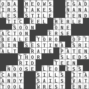 ACROSS 1. Chief or king in Benin or Nigeria 4. Catcalls? 9. Mild oath 13. Big collection agency 14. Proceeds 15. Grandmother 16. French article 17. Vertical member of a panel or frame 18. Watch over 19. Nervous spasm 21. Snakelike fish 22. Haggard of country music 24. Within a short period 26. Single 27. Gambison 29. Celtic language 30. Calif. Air Force Base 31. "Corrida" creature 33. Often (poetically) 36. Storage container 37. French poetic form 40. _ Lanka 41. Keyboard modifier key 42. Pace 43. Eucharist need 45. Son of Odin 47. Bobsleighs 48. To free from 49. Adolescent 50. Trap for birds or small mammals 52. Lion 54. Curvy letter 56. Patter 57. Beverly of Met fame 59. Call ___ day 61. Actor Griffith 62. Moves on water 63. Large container 64. Implement 65. Obtain by seizing forcibly or violently 66. Compass dir. DOWN 1. Lubricate 2. Cy Young winner Saberhagen 3. Aide 4. Mountains (abbr.) 5. Eroded 6. Migrant worker of the '30s 7. Not ill 8. Compass dir. 9. Main course 10. Highlander 11. Queen of England 1702-14 12. June honoree 20. Calm and collected 22. Person of subnormal intelligence 23. Followers of ems 25. Washington bills 27. Swedish rock group 28. To provide with a ceiling 29. 4th largest of the Great Lakes 31. Russian ruler of old 32. Baseball player Mel 33. Clearly or manifestly demonstrative 34. Flintstone 35. Airtight sealed metal containers 38. Wear away 39. Domed church section 44. Toward shelter 45. TNT 46. Part of HMS, perhaps 49. For Whom the Bell _____ 50. Billionth: prefix 51. Southwest Nigerian state 52. One who doesn't tell the truth 53. Writer Wiesel 55. Comedian Laurel of Laurel & Hardy 56. Feline 57. Compass dir. 58. Fast jet (abbr.) 60. Had dinner