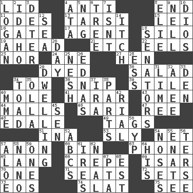 ACROSS 1. Flaplike covering 4. Against 8. Conclude 11. Lyric poems 13. Tarsus (plural) 15. Flowery wreath 16. Yard entry 17. Representative 18. Grain storage tower 19. Toward the future 21. And so on (abbr.) 22. Snakelike fish 23. Or not 24. One (Scot) 27. Layer 29. Colored 30. Vegetable dish 34. Pull behind 36. Clip 39. Vertical member of a panel or frame 40. Undercover agent 41. Ethiopian city, capital of Harari 43. Sign of something about to happen 44. Shopping centers 46. Indian skirt 47. Portuguese money of account (variant) 48. Peak District village in England 49. Labels 51. _ tizzy (2 wds.) 53. Playfully artful 54. Fish or hair follower 57. Soon (poet.) 60. Storage container 63. Give a jingle 65. Long (Scottish) 66. Streamer paper 69. Austrian river, tributary to the Danube 70. Single 71. Theater features 72. Puts into a specified state 73. Greek goddess of the dawn 74. Narrow board 75. Perceive with the eye DOWN 1. Utah city north of Ogden 2. Potato state 3. Prevent from occurring 4. _ moment's notice (2 wds.) 5. Tired old horse 6. Family _ (genealogy) 7. Is not 8. Writer Wiesel 9. 1994 drama film starring Jodie Foster 10. "Vaya con ____" 12. Ocean 14. Hankering 18. Elected representatives 20. 24 hours 25. Soft 26. Ferber et al. 28. Curvy letter 29. Residence 31. Welles in "The Third Man" 32. Toward shelter 33. Lair 34. Frog relative 35. Spanish pot 37. Lyricist Gershwin 38. Pieces 40. Madame (abbr.) 42. Monetary unit of Yemen 45. Elected rep. 50. Con 52. Lettered men learn these first 54. Olfactory organs 55. Related on the mother's side 56. Laconic 57. _ vera 58. Billionth: prefix 59. Washington bills 61. Angers 62. Be tempered by heat 64. Part of HMS, perhaps 67. Parent Teacher Assoc. 68. Eastern Standard Time (abbr.)