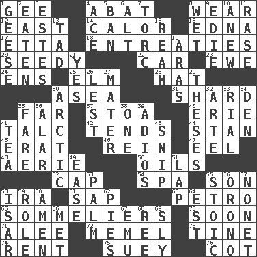 ACROSS 1. Turn to the right 4. Blind as ____ 8. Erode 12. 90 degrees 14. Bodily heat indicating an inflammation 16. Pulitzer Prize-winning author Ferber 17. Singer James 18. Pleas 20. Sleazy 22. Auto 23. She-sheep 24. Followers of ems 25. Shade tree 28. Floor covering 30. Toward the sea 31. Broken piece 35. Distant 37. Portico 40. One of the Great Lakes 41. Baby powder 42. Is inclined (to) 44. Comedian Laurel of Laurel & Hardy 45. Part of Q.E.F. 46. It's straight from the horse's mouth 47. Snakelike fish 48. Nest on high 50. Lubricates 52. Head covering 54. Health resort 55. Boy, to dad 58. Retirement account (abbr.) 61. Plant excrement 63. Stone: prefix 65. Wine waiters 70. Within a short period 71. Toward shelter 72. Klaipeda city 73. Prong on a fork 74. Monthly bill 75. Chop _ 76. Small bed DOWN 1. Honkers 2. Ingested 3. _____ Park, CO 4. Adept person 5. Prohibit 6. Keyboard modifier key 7. Torque (variant) 8. Dripping 9. Singer Brickell 10. Afresh 11. To erase 13. Bit 15. 480, 500 or 516 sheets of paper 19. Ancient river in northeast Turkey 21. Consenting reply 26. For fear that 27. Mother 29. College papers 30. Northern region 32. Johnson of "Laugh-In" 33. Monetary unit of Yemen 34. Lair 35. Conductor's collection 36. Having or resembling wings 38. Single 39. Goodbye (Sp.) 41. Afternoon social gathering 43. Sever or remove by pinching or nipping 49. Comfort 51. Pet locale 53. Inside of hand 55. Unemotional 56. U. of Maine site 57. Music written for nine 58. Austrian river, tributary to the Danube 59. Hero or heavy, e.g. 60. So be it 62. Sliced desserts 64. Eastern Standard Time (abbr.) 66. Was introduced to 67. Australian flightless bird 68. To riddle 69. Mischievous