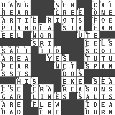ACROSS 1. Mild oath, euphamism for damn 5. Elected rep. 8. Feline 11. Posterior 12. Algonquian 14. Single 15. Nick name for Arthur 17. Disturbances 18. Enemy 19. Player piano 21. R.R. building 22. Avid follower 23. Snakelike fish 24. Not either 25. Shoshoni 27. _ Lanka 28. Snakelike fish 31. Table seasoning 35. It would 37. Highlander 38. Length times width 39. Affirmative reply 41. Ballerina skirt 42. Lightbulb-shaped fruit 43. Fish or hair follower 45. Connect, as a bridge 46. Fast planes 47. Two (Sp.) 49. Part of HMS, perhaps 51. Make supply last 52. Ocean 55. Compass dir. 57. Epoch 60. Thinks logically 62. Slender fish 63. Citrus fruits 65. Table seasonings 66. "We ___ not amused" (Victoria) 67. Soared 68. The content of cognition 69. Male parent 70. Compass dir. 71. Dormintory (informal) DOWN 1. Window treatment 2. Nest on high 3. Brizilian seaport 4. Broad smile 5. _-fi 6. Greek god of love 7. Remaining after all deductions 8. Java holder (2 wds.) 9. Small Philippine buffalo 10. Adolescent 13. He sold his birthright 16. Immeasurably long periods of time 17. Noteworthy scarcity 20. Australian parrot (variant) 26. Trials 29. Globular water bottle used in Asia 30. Surprise greatly 31. Plant excrements 32. Ancient Greek god of war 33. Tough but pliablecoriaceous 34. Tarsus (plural) 36. Lair 40. Spring feasts 44. Casino tip 48. Oceans 50. Automatically 52. Twentieth part of a lira 53. Keyboard key 54. Indian state 55. Mild oath 56. "Two Mules for Sister ____" 58. Cause heat under the collar 59. So be it 61. Expressed in words 64. She-sheep