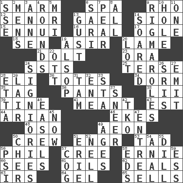 ACROSS 1. Excessive but superficial compliments 6. Health resort 9. 17th letter of the Greek alphabet 12. Sir (Sp.) 13. Highlander 14. The Jewish people; Israel 15. World-weariness 16. Mountain range 17. Stare 18. Elected rep. 19. SW Saudi Arabia district 20. Unable to walk 21. Dunce 23. Mouth or opening 24. Fast planes 25. Laconic 28. Biblical high priest 30. Hauls 34. Dormintory (informal) 35. Label 36. Leg coverings 38. Cards in a Roman deck? 39. Prong on a fork 41. Intended 43. Eastern Standard Time (abbr.) 44. Believer in; advocate of (suffix) 46. Supplements with great effort 48. Bear (Spanish) 49. Age 50. Ship's personnel 51. Engineer (abbr.) 53. Small boy 56. Silvers or Donahue 57. Algonquian 58. Bert's buddy 60. Perceives with the eye 61. Lubricates 62. Allots cards 63. Big collection agency 64. Set 65. Exchanges for money DOWN 1. Compass dir. 2. Not women's 3. Queen of England 1702-14 4. Periods in a boxing match 5. Medical imaging device (abbr.) 6. Indian skirt 7. Lightbulb-shaped fruit 8. Everything 9. Frustrating wastes of time 10. Opening into or through something 11. Single 13. Abrupt rush of wind 14. Flew 19. Columnist Joseph or Stewart 20. Car dealer's back yard 22. Baseball player Mel 24. Seigniories (variant) 26. Indian titles of respect 27. Send forth 28. Singer James 29. Den 31. Scottish cap 32. Compass dir. 33. R.R. building 37. Scornful expression 40. Artist's stands 42. Ring climax 45. At this time 47. Main course 49. Grows older 50. "Mermaids" star 51. One of the Great Lakes 52. 1994 drama film starring Jodie Foster 54. Of or related to the anus 55. Deli pickle 56. Air pressure measure (abbr.) 57. Gear tooth 58. Begley and Asner 59. Curvy letter