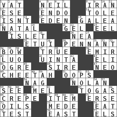 ACROSS 1. Large container 4. Famous astronaut Armstrong 8. SW Asia republic 12. Compass dir. 13. Inside; within (prefix) 14. Lacquered or enameled metalware 15. Is not 17. Genesis locale 18. An organ shaped like a helmet 19. Brizilian seaport 21. Set 23. Snakelike fish 24. Small island 26. Teachers' org. 28. Needle holder 30. Pre-World Series prize 34. Arrow shooter 37. Loyal 39. Arab leader 40. Nilotic language 41. National forest in Provo, Utah 43. Biblical high priest 44. Legendary monster 46. Father 47. Modern: prefix 48. Leopard's kin 51. I made a mistake 54. Tired old horse 55. Pitcher Ryan 58. Observe 61. Cartoonist voice _ Blanc 63. Ancient Roman robes 65. Streamer paper 67. A distinct part 71. Celtic language 72. Petroleums 73. Ancient Persian 74. Consume 75. Trial 76. 90 degrees 77. Raised railways DOWN 1. Distinctive style or manner 2. Slender Brazilian palm 3. Portable shelters 4. Born 5. Conclusion 6. Binary compound 7. Having great length 8. Call ___ day 9. Hero or heavy, e.g. 10. Toward shelter 11. Anneal 16. Story 18. Small, secluded valley 20. Allow 22. Compass dir. 25. Ballerina skirt 27. A saturated hydrocarbon 29. From or relating to Ireland 30. Stone: prefix 31. So be it 32. "Death on the ____" 33. Musical group of three 34. Coalition 35. Ending for "Through" and "Enough" 36. Had on 38. University (slang) 42. Age 45. Car or cant ending 49. Not wild 50. Ripen 52. Plant holder 53. A type of plum 56. Match 57. Rhinal 58. Native of Scotland 59. One of the Great Lakes 60. Snakelike fish 62. Welles in "The Third Man" 64. Puts into a specified state 66. Pacific Standard Time (abbr.) 68. Beverage made from leaves 69. Begley and Asner 70. Was introduced to
