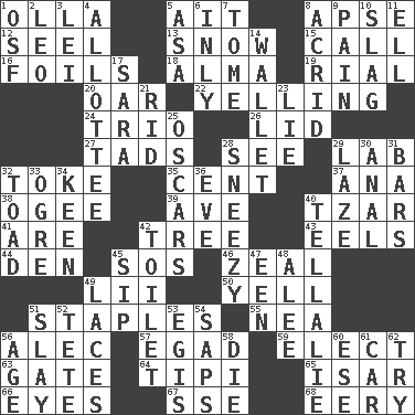 ACROSS 1. Spanish pot 5. Small island 8. Domed church section 12. Stitch closed the eyes of (a falcon) 13. Overwhelm 15. Give a ring to 16. Fencing necessities 18. _ mater 19. Monetary unit of Yemen 20. Rowing implement 22. Crying or shouting loudly 24. Musical group of three 26. Hat (slang) 27. Small boys 28. Observe 29. Experiment locale 32. Casino tip 35. Penny 37. Santa ___, CA 38. Double curve, resembling the letter S 39. "___ Maria" 40. Russian ruler 41. "We ___ not amused" (Victoria) 42. Relationship diagram 43. Snakelike fish 44. Lair 45. Mayday 46. Ardor 49. Cards in a Roman deck? 50. Shout 51. Paper fasteners 55. Teachers' org. 56. Actor Baldwin 57. Mild oath 59. Voters do this 63. Yard entry 64. Native american tent (variation) 65. Austrian river, tributary to the Danube 66. Snake ____ (dice throw) 67. Compass dir. 68. Suggestive of the supernatural DOWN 1. Order of Saint Francis (abbr.) 2. Lion 3. Luau accessory 4. One to whom something is allotted 5. White ___ sheet 6. In an inward manner 7. Heavy book 8. Sour-tasting 9. Ache 10. Volcanic refuse 11. Pipe bend 14. Place for singles 17. "Two Mules for Sister ____" 21. To free from 23. Falsehood 25. Motion picture awards 28. Dwarf with a sinus problem 29. Goldbrick 30. Of or related to the anus 31. Long, evenly shaped pieces 32. Frog relative 33. Legendary monster 34. Peachy ____! 36. Night before a holiday 40. Copy Pinocchio 42. Rest room 45. Small drink 47. Car or cant ending 48. Toward shelter 49. Shoestrings 51. Kill 52. False hair 53. Armor plate that protects the chest 54. Plant excrements 56. Personal question 58. Expire 60. Compass dir. 61. Auto 62. Attempt to accomplish something
