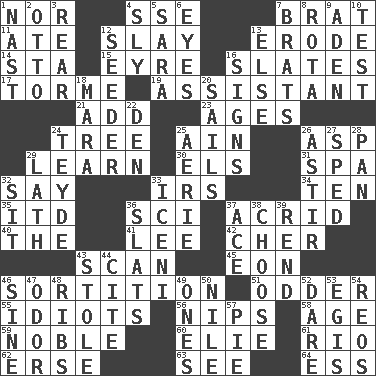 ACROSS 1. And not 4. Compass dir. 7. Naughty child 11. Had dinner 12. Kill 13. Eat (away) 14. R.R. building 15. Jane of fiction 16. Chalkboards 17. Singer Mel 19. Helper 21. Increase 23. Eras 24. Relationship diagram 25. The 18th letter of the Arabic alphabet 26. Cleo's killer 29. Acquire or gain knowledge or skills 30. Raised railways 31. Health resort 32. Declare 33. Big collection agency 34. "___ Little Indians" 35. It would 36. _-fi 37. Bitter 40. Definite Article 41. Area sheltered from the wind 42. "Mermaids" star 43. Examine minutely or intensely 45. Period of immesurable duration 46. Conclusion 51. More peculiar 55. Foolish or stupid persons 56. Pinches, bites 58. Personal question 59. Impressive in appearance 60. Writer Wiesel 61. _ de Janeiro 62. Celtic language 63. Observe 64. Double-curved letter DOWN 1. Political cartoonist Thomas 2. "Beetle Bailey" pooch 3. Tail end 4. Mischievous 5. "Two Mules for Sister ____" 6. Sight organs 7. Naughty children 8. Round or rotation of duties 9. An important port of Yemen 10. Trial 12. Sowing specialist 13. Otherwise 16. Public displays of written messages 18. Hindu Mythology: god of death 20. Moves on water 22. Lair 24. Miss Universe 1986, Barbara Palacios _ 25. Nest on high 26. Having gotten out of bed 27. Moved rapidly 28. Baking dish 29. Thin strip of wood or metal 32. Be seated 33. Ancient Celtic tribe of eastern Britain 36. Narrow boards 37. Adept person 38. Opt 39. Tear apart 43. Took without asking 44. Quote 46. Trig term 47. Scent 48. Chest bones 49. Singles 50. Mediterranean tributary 52. Have the gumption 53. Armor plate that protects the chest 54. Vintage cars 57. Sliced dessert