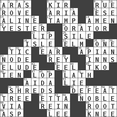 ACROSS 1. Caspian sea tributary 5. Apertif with cassis 8. Regret 11. Be footloose 12. Operatic vocal solo 14. Compass dir. 15. Place in a line 17. Pack (down) 18. So be it 19. Last 21. Speaker 23. Mouth edge 25. Drop; flow; fall 26. Small island 27. Shade tree 28. Single 31. Nervous spasm 33. Hearing organ 35. Bee-related 37. Thickened enlargement 38. Marina Del _, California 40. Lodging establishments 41. Evade 43. Snakelike fish 45. Ring climax 46. Nine, plus one 47. Chop off 50. Thin strip of wood or metal 52. Opera by Verdi 53. Falsehood 54. Fragments 56. Outscore 61. Relationship diagram 62. Singer James 65. Impressive in appearance 66. By way of 67. It's straight from the horse's mouth 68. Carrot, for example 69. Viper 70. Area sheltered from the wind 71. Leg joint DOWN 1. Like ___ of sunshine 2. Hero or heavy, e.g. 3. Advice 4. Emitted 5. Krazy ___ of comics 6. Lyricist Gershwin 7. Full of chinks, cracks, or crevices 8. San ____ (Riviera town) 9. One who uses or employs something 10. Car or cant ending 13. Showery time 16. Snakelike fish 18. Had dinner 20. Cause heat under the collar 22. _ mater 24. Lightbulb-shaped fruit 26. On the rocks 28. Pig sound 29. Billionth: prefix 30. Followers of ems 31. Lacquered or enameled metalware 32. Goddess of spring and wife of Bragi 34. To riddle 36. Heart or essence 37. Fish or hair follower 39. Shout 42. Writer Wiesel 44. Put down 48. More peculiar 49. Soft color 51. Adolescent 52. "We ___ not amused" (Victoria) 54. Indian titles of respect 55. Pile 57. Tined utensil 58. Inky black, to poets 59. Medicinal plant 60. False hair 61. Federal power corp. 63. Make a knot 64. One (Scot)