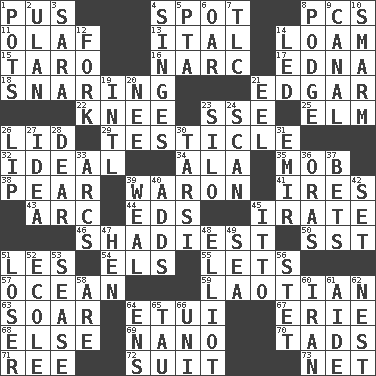 ACROSS 1. Festering 4. Specific locale 8. Personal Computers (abbr.) 11. Norwegian king 13. Slanted text style (abbr.) 14. Rich soil 15. Pacific island yam 16. Drug cop 17. Pulitzer Prize-winning author Ferber 18. Catching in a trap 21. _ Allan Poe 22. Leg joint 23. Compass dir. 25. Shade tree 26. Hat (slang) 29. A testis 32. Perfect 34. Wing 35. Crowd into 38. Lightbulb-shaped fruit 39. Make _____ (do battle with) 41. Angers 43. Curve 44. Begley and Asner 45. Feeling or showing extreme anger 46. Most dark, concealed or hidden 50. Fast jet (abbr.) 51. French article 54. Raised railways 55. Allows 57. Sea 59. Of or relating to Laos or its people 63. Fly high 64. Needle holder 67. 4th largest of the Great Lakes 68. Otherwise 69. Billionth: prefix 70. Small amounts or degrees 71. To sift 72. Set of matching outer garments 73. Fish or hair follower DOWN 1. Plant holders 2. Uhlan (variant) 3. "Two Mules for Sister ____" 4. Scorches 5. Parent Teacher Assoc. 6. Boat paddle 7. Affectionate concern, for short 8. Puddle 9. Lessep's creation 10. Excessive but superficial compliments 12. Tined utensil 14. Directed 19. International (abbr.) 20. Born 21. Snakelike fish 23. Grain storage tower 24. Glance over 26. Mouth edge 27. The main thing one is thinking about 28. Letter starter 30. Tarsus (plural) 31. Independent ruler or chieftain 33. Curves 36. Mouths or openings 37. Antes 39. Welt 40. Sums up 42. Arrange properly for use 45. "Tell ____ the Marines!" 47. Layer 48. American author Paul (1891-1958) 49. Ocean 51. Failure 52. Learning spot: Fr. 53. Gospel singer Marvin 56. Proofreading order 58. "We ___ not amused" (Victoria) 60. SW Asia republic 61. Assistant 62. A home for chicks 64. Followers of ems 65. The 19th letter of the Greek alphabet 66. Single; one (prefix)