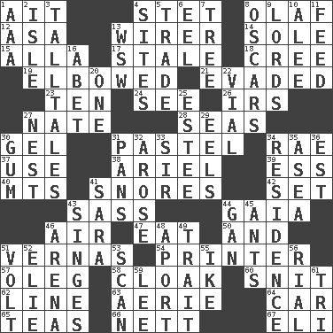 ACROSS 1. Small island 4. Proofreading order 8. Norwegian king 12. White ___ sheet 13. One who wires 14. Flatfish 15. Silent film actress Nazimova 17. Lacking originality or spontaneity 18. Algonquian 19. Turned at an angle; bent 21. Dodged 23. "___ Little Indians" 24. Observe 26. Big collection agency 27. Nathan's nickname 28. Oceans 30. Set 31. Soft color 34. Actress Charlotte 37. Purpose 38. Satellite of Uranus 39. Double-curved letter 40. Mountains (abbr.) 41. Sounds asleep 42. Arrange properly for use 43. Backtalk 44. Greek goddess of the earth (variant) 46. Atmosphere 47. Erode 50. Added to 51. Actresses Bloom and Felton 54. Hard copy producer 57. Cassini of fashion 58. Covering 60. In a ____ (agitated or irritated) 62. Actor's bit 63. Nest on high 64. Automobile 65. Beverages made from leaves 66. Remaining after all deductions 67. Connecticut Ivy Leaguer DOWN 1. American Automobile Association (abbr.) 2. Small island 3. Baron Munchausen's specialties 4. Locates 5. Exchange 6. Snakelike fish 7. Family _ (genealogy) 8. Motion picture awards 9. Nobles 10. Toward shelter 11. Nourish 13. Compass dir. 16. Collude with 20. Single 22. Small bottle 25. First name in cosmetics 27. A home for chicks 29. Snakelike fish 30. Chewing product 31. Zero-star reviews 32. Came up 33. Title for a knight 34. Home 35. At sea 36. Eastern Standard Time (abbr.) 41. "Two Mules for Sister ____" 43. Scorches 44. Separate the seeds from cotton 45. Pismires 46. Sports stadium 48. To the left, to Queeg 49. Distinguishing feature 51. Electrical Unit 52. Writer Wiesel 53. Examine hastily 55. Eisenhower's nickname 56. Monetary unit of Yemen 59. Area sheltered from the wind 61. Three (prefix)