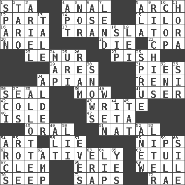 ACROSS 1. R.R. building 4. Of or related to the anus 8. Bowlike part 12. Piece 14. Airs 15. _ and Stitch 16. Roberta Peters solo 17. Interpreter 20. Christmas carol 21. Expire 22. Tax preparer (abbr.) 23. Arboreal primate 27. Expression of disdain 29. Ancient Greek god of war 31. Sliced desserts 34. Bee-related 35. Painter Guido (1575-1642) 36. Lick closed 39. Cut the grass 41. One who makes use of a thing 42. Lacking warmth 43. Compose 46. Small island 47. Bristle 48. Spoken 51. Brizilian seaport 54. Nonscientific branch of learning 56. Falsehood 58. Cuts off 61. Happening in regular succession 66. Needle holder 67. Clement's nick name 68. 4th largest of the Great Lakes 69. Not ill 70. Ooze 71. Plant excrements 72. Actress Charlotte DOWN 1. Connect, as a bridge 2. Edible starchy tuberous root 3. Satellite of Uranus 4. Fitting 5. And not 6. White ___ sheet 7. Grant temporary use of 8. Insect wing 9. Actors Guy, Robert Welles, and Clint 10. Hoof sound 11. Israeli folk dance 13. Lie 18. Small drink 19. Flowery wreath 24. Atlas unit 25. RI univ. 26. 480, 500 or 516 sheets of paper 28. Upset 30. Frozen precipitation (plural) 32. Compass dir. 33. Title for a knight 34. Tree or shrub in the Birch family 36. _-fi 37. Greek goddess of the dawn 38. One to whom something is allotted 40. Songbird 44. Call ___ day 45. Make lace 49. The first octave above the treble staff 50. Cards in a Roman deck? 52. Afresh 53. 61 cubic inches 54. Arches 55. Hero or heavy, e.g. 57. Nights before holidays 59. Monetary unit of Botswana 60. Filth; sediment 62. Electrical Unit 63. Epoch 64. Mouth edge 65. It is so
