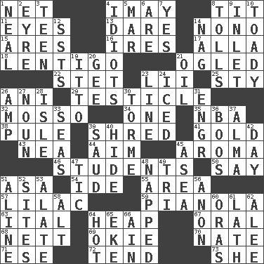 ACROSS 1. Fish or hair follower 4. "If ____ say so..." 8. Teat (slang) 11. Snake ____ (dice throw) 13. Have the gumption 14. Words to Nanette 15. Ancient Greek god of war 16. Angers 17. Silent film actress Nazimova 18. Small, flat, pigmented spot on the skin 21. Stared at amorously 22. Proofreading order 23. Cards in a Roman deck? 25. Filthy place 26. Cuckoo 29. A testis 32. With motion or animation 34. Single 35. Basketball assoc. 38. Whine 39. Tear up 41. Aureate 43. Teachers' org. 44. Direct toward a target or goal 45. Scent 46. SAT takers 50. Declare 51. White ___ sheet 54. Binary compound 55. Length times width 57. Pale purple color 59. Player piano 63. Slanted text style (abbr.) 64. Pile 67. Of the mouth 68. Remaining after all deductions 69. Migrant worker of the '30s 70. Nathan's nickname 71. Compass dir. 72. Look after 73. A female animal or person DOWN 1. Be tempered by heat 2. Jane of fiction 3. Adolescent 4. Foolish or stupid persons 5. Third mo. 6. "We ___ not amused" (Victoria) 7. It is so 8. For Whom the Bell _____ 9. An arm off of a larger body of water 10. Sycophant 12. Fast planes 14. Tired old horse 19. "Tell ____ the Marines!" 20. Turn to the right 21. Petroleum 23. Actor's bit 24. On the rocks 26. Electrical Unit 27. Part of speech 28. Capri or Wight 30. Singer Mel 31. Engineer (abbr.) 33. Oceans 36. Expressions of contempt or scorn 37. _ mater 39. Saudi Arabian king (1953-1964) 40. Flintstone garb 42. 24 hours 45. At sea 47. Nervous spasm 48. Slept 49. Three (prefix) 51. Place in a line 52. Locates 53. Having winglike extensions 56. Soon (poet.) 58. The first octave above the treble staff 60. Mouths or openings 61. Thin strip of wood or metal 62. Toward shelter 64. Being at a high temperature 65. Make supply last 66. The 18th letter of the Arabic alphabet