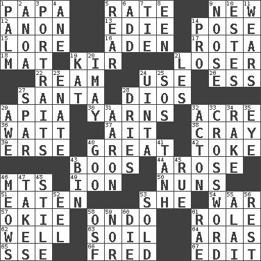 ACROSS 1. Dad 5. Assign a rank or rating to 9. ___ Haven, CT 12. At once, immediately (arch.) 13. Singer Brickell 14. Introduce or present, as a question 15. Old wives' tales, e.g. 16. Arabian gulf 17. Round or rotation of duties 18. Floor covering 19. Apertif with cassis 21. Failure 22. 480, 500 or 516 sheets of paper 24. Purpose 26. Double-curved letter 27. Before Barbara or Clara 28. "Vaya con ____" 29. Capital of Western Samoa 30. Entertaining tales 32. 43,560 square feet 36. Electrical Unit 37. Small island 38. Supercomputer manufacturer 39. Celtic language 40. Relatively large 42. Casino tip 43. Expressions of contempt or scorn 44. Came up 46. Mountains (abbr.) 49. Electrically charged atom 50. Religious women 51. Consumed 53. A female animal or person 54. Armed conflict 57. Migrant worker of the '30s 58. Southwest Nigerian state 61. Hero or heavy, e.g. 62. Water source 63. Earth 64. Ancient river in northeast Turkey 65. Compass dir. 66. Flintstone 67. Prepare for publication DOWN 1. Inside of hand 2. Small Philippine buffalo 3. Likenesses of persons 4. A saturated hydrocarbon 5. Bring up, as a child 6. Say or write further 7. Standoff 8. Car or cant ending 9. Trap for birds or small mammals 10. _____ Park, CO 11. Erodes 14. Adept person 19. Krazy ___ of comics 20. "If ____ say so..." 21. French article 23. Maternal 24. National forest in Provo, Utah 25. Distress signal 27. Practice fight 28. Frees from moisture 29. Deep reverence 31. Composer Copland 32. NE Massachussets city 33. What you're doing now 34. Libertine 35. Sight organ 40. Thick or sticky substance 41. Hyperbolic tangent 43. Storage container 45. Regret 46. Catcalls? 47. Receives possession of 48. Vertical member of a panel or frame 52. Snakelike fish 53. Disposed of to a purchaser 55. Jai _ 56. Respite 58. Order of Saint Francis (abbr.) 59. Not either 60. Expire 61. Actress Charlotte
