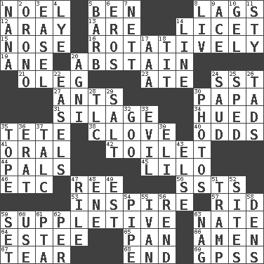 ACROSS 1. Christmas carol 5. Benjamin's nick name 8. Straggles 12. Like ___ of sunshine 13. "We ___ not amused" (Victoria) 14. It is permitted: Lat. 15. Olfactory organ 16. Producing rotation 19. One (Scot) 20. Choose not to consume 21. Cassini of fashion 23. Had dinner 24. Fast jet (abbr.) 27. Pismires 30. Dad 31. Fodder prepared in a silo 34. Became colored 35. False hair 38. Garlic unit 40. Probability 41. Relating to the mouth 42. Bathroom 44. Friends 45. _ and Stitch 46. And so on (abbr.) 47. To separate or throw off 50. Fast planes 53. Stimulate to action 57. To free from 59. Supplementary 63. Nathan's nickname 64. First name in cosmetics 65. Baking dish 66. So be it 67. Separate forcefully 68. Conclusion 69. Global Positioning Systems (abbr.) DOWN 1. Nanny 2. U. of Maine site 3. Artist's stand 4. Potassium hydroxide 5. Sharp remark 6. Greek god of love 7. Remaining after all deductions 8. 54 in ancient Rome 9. Adept person 10. Set 11. Filthy place 14. Actor's bit 17. American Automobile Association (abbr.) 18. Teat (slang) 20. Hindu god of fire 22. Artist's stands 24. Saudi Arabian king (1953-1964) 25. Drove too fast 26. Small boys 28. Affectionate concern, for short 29. Table seasoning 30. Pictures 32. Thick or sticky substance 33. Morally bad or wrong 35. Drink excessively 36. Part of Q.E.F. 37. Baby powder 39. Connecticut Ivy Leaguer 43. Otherwise 47. Cause heat under the collar 48. Compass dir. 49. Eastern Standard Time (abbr.) 51. _____ steamer (cargo ship) 52. Settings 54. Corncob 55. _ the terrible 56. Tear apart 58. Hiding places for outlaws 59. Arrange properly for use 60. Purpose 61. Parent Teacher Assoc. 62. For each 63. Tired old horse