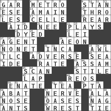 ACROSS 1. Slender fish 4. Paris' subway 9. Comedian Laurel of Laurel & Hardy 13. Compass dir. 14. At full speed 15. Through, poetically 16. French article 17. Cell (Danish) 18. Posterior 19. Help 21. Born 22. Frolics 24. Colored 26. Flowery wreath 27. Representative 29. Age 30. Music written for nine 31. South American Indian 33. Leather borer 36. Affectionate concern, for short 37. Contrary to your interests or welfare 40. Ocean 41. Binary compound 42. Assign a rank or rating to 43. Indian state 45. Glance over 47. Vertical member of a panel or frame 48. Infant locale 49. Vintage cars 50. Related on the mother's side 52. Beverage made from leaves 54. Parent Teacher Assoc. 56. Blind as ____ 57. Effrontery 59. Chicken ___ king 61. Characteristic smell of wine 62. Fertile tracts in a desert 63. Tired old horse 64. Pismires 65. Take or capture by force 66. Neckwear DOWN 1. Set 2. Toward the sea 3. Home 4. Apple computer (short form) 5. Make improvements or corrections to 6. Story 7. Cause heat under the collar 8. Single 9. Put through a sieve 10. Those people 11. Caspian sea tributary 12. Or not 20. Unit of force 22. Entreaties 23. Lion 25. Singer James 27. Against 28. Aureate 29. 43,560 square feet 31. "Terrible" tsar 32. Fish or hair follower 33. Aide 34. Welt 35. Unable to walk 38. Window treatment 39. Relaxation 44. Cease 45. Chalkboards 46. Domesticated feline 49. All-night dance parties 50. Inky black, to poets 51. Political cartoonist Thomas 52. Rend 53. Celtic language 55. Jai _ 56. Santa ___, CA 57. At this time 58. Eastern Standard Time (abbr.) 60. Grow older