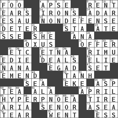 ACROSS 1. Egg _ yung 4. Domed church section 8. Monthly bill 12. Hearing organs 14. Metal shackles 16. The sixth month of the Jewish calendar 17. He sold his birthright 18. Unrelated to defense, as in spending 20. Prevent from occurring 22. R.R. building 23. Had dinner 24. Compass dir. 25. A female animal or person 28. Santa ___, CA 30. The longest river in Central Asia 31. Auction bid 35. And so on (abbr.) 37. Inactive volcano in Sicily 40. Tall New Zealand timber tree 41. Singer Brickell 42. Allots cards 44. Writer Wiesel 45. Nanny 46. Mild oath 47. Arrange properly for use 48. Make improvements or corrections to 50. Hyperbolic tangent 52. Ocean 54. Make supply last 55. Cleo's killer 58. Afternoon social gathering 61. According to 63. Showery time 65. Abnormally rapid or deep breathing 70. Hoop that covers a wheel 71. Operatic vocal solo 72. Sir (Sp.) 73. At sea 74. Lacerate 75. Gone 76. Double-curved letter DOWN 1. Gives food to 2. Fertile tracts in a desert 3. Speak pompously 4. The 18th letter of the Arabic alphabet 5. Adept person 6. Boy, to dad 7. Conclusions 8. Actress Charlotte 9. Pulitzer Prize-winning author Ferber 10. Political cartoonist Thomas 11. Family _ (genealogy) 13. Take to court 15. Bristle 19. Papal veil 21. Acura sports coupe 26. Took on color 27. First name in cosmetics 29. Anew 30. Seas 32. Do some clerical work 33. Give off 34. Regret 35. Dutch treat 36. Prong on a fork 38. Tired old horse 39. Having winglike extensions 41. Compass dir. 43. Neighbor of Neb. 49. Letter starter 51. Teachers' org. 53. High mountains 55. Ascend 56. Begets 57. Entreaties 58. Not this but _ 59. Jane of fiction 60. Capital of Western Samoa 62. Afresh 64. Parent Teacher Assoc. 66. Hearing organ 67. Single 68. Period of immesurable duration 69. Nonscientific branch of learning