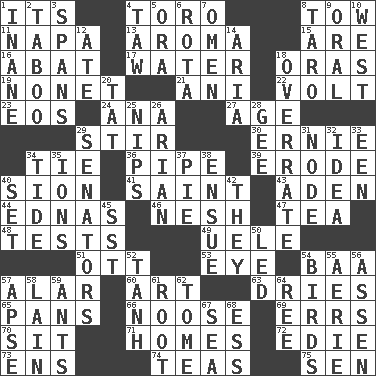 ACROSS 1. It is 4. "Corrida" creature 8. Pull behind 11. California wine valley 13. Scent 15. "We ___ not amused" (Victoria) 16. Blind as ____ 17. Wetness 18. Mouths or openings 19. Music written for nine 21. Black tropical American cuckoo 22. Electrical Unit 23. Greek goddess of the dawn 24. Santa ___, CA 27. Personal question 29. Use a spoon 30. Bert's buddy 34. Standoff 36. Corncob 39. Wear away 40. The Jewish people; Israel 41. Inhabitant of Heaven 43. Arabian gulf 44. Ferber et al. 46. Tender 47. Afternoon social gathering 48. Trials 49. Ubangi River tributary 51. Baseball player Mel 53. Sight organ 54. Sound made by sheep 57. Having or resembling wings 60. Nonscientific branch of learning 63. Frees from moisture 65. Baking dishes 66. Trap for birds or small mammals 69. Blunders 70. Be seated 71. Residences 72. Singer Brickell 73. Followers of ems 74. Beverages made from leaves 75. Elected rep. DOWN 1. Lacking in sense or substance 2. Off limits 3. Connects, as a bridge 4. The 23rd letter of the Hebrew alphabet 5. Mouth or opening 6. Round or rotation of duties 7. Presage 8. Edible starchy tuberous root 9. Spoken 10. 270 degrees 12. Had dinner 14. Roberta Peters solo 18. Make much ado about nothing 20. Make lace 25. Pinches, bites 26. Believer in; advocate of (suffix) 28. Turn to the right 29. Elected representatives 31. Connecting point 32. The main thing one is thinking about 33. Car or cant ending 34. Periodic rise and fall of the sea level 35. Charged atoms 37. Sliced dessert 38. Follow as a consequence or result 40. Arrange properly for use 42. Those people 45. Fast jet (abbr.) 50. Directed 52. Hyperbolic tangent 54. Avian creatures 55. Nest on high 56. NE Netherlands city 57. Domed church section 58. (Had) reclined 59. Pismires 61. Carrot, for example 62. Heavy book 64. To separate or throw off 67. Ocean 68. Double-curved letter