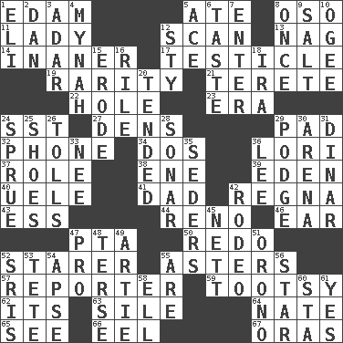 ACROSS 1. Dutch treat 5. Had dinner 8. Bear (Spanish) 11. Kenny Rogers chart-topper in '80 12. Examine hastily 13. Tired old horse 14. Sillier 17. One of the two male reproductive glands 19. Noteworthy scarcity 21. Cylindrical with tapered ends 22. Opening into or through something 23. Epoch 24. Fast jet (abbr.) 27. Cub Scout units 29. Groovy apt. 32. Give a jingle 34. Two (Sp.) 36. Australian parrot (variant) 37. Hero or heavy, e.g. 38. Compass dir. 39. Paradise 40. Ubangi River tributary 41. Male parent 42. Canadian anthropologist Darnell 43. Curvy letter 44. Former U.S. Attorney General Janet 46. Ewer handle 47. Parent Teacher Association (abbr.) 50. Do over again 52. A viewer who gazes fixedly 55. Michaelmas daisies 57. News announcer 59. Tootsie (variant) 62. It is 63. Filth; sediment 64. Nathan's nickname 65. Perceive with the eye 66. Snakelike fish 67. Mouths or openings DOWN 1. Connecticut Ivy Leaguer 2. Daniel's nick name 3. The sixth month of the Jewish calendar 4. Non-adult bird? 5. Adept person 6. Clothes sense 7. Keyboard key 8. At one time in the past 9. Table seasoning 10. Double curve, resembling the letter S 12. Filthy place 15. Eat (away) 16. Cause heat under the collar 18. Retirement account (abbr.) 20. Looked after 24. Disorder 25. Imelda's hoard 26. For Whom the Bell _____ 28. Echolocation 29. Porridge 30. Sports stadium 31. Middle Eastern gold or silver currency 33. Born 35. Spring feasts 36. Area sheltered from the wind 42. Cowboy competition 45. Remaining after all deductions 47. Adept person 48. Laconic 49. Nick name for Arthur 51. U. of Maine site 52. Indian titles of respect 53. False hair 54. Domed church section 55. "We ___ not amused" (Victoria) 56. Play the lead 58. Pipe bend 60. R.R. building 61. Consenting reply