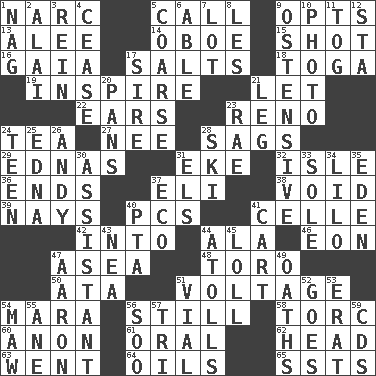 ACROSS 1. Drug cop 5. Give a ring to 9. Chooses 13. Toward shelter 14. Mitch Miller's instrument 15. Attempt 16. Greek goddess of the earth (variant) 17. Table seasonings 18. Ancient Roman robe 19. Heighten or intensify 21. Allow 22. Hearing organs 23. Western Nevada city 24. Afternoon social gathering 27. Born 28. Droops 29. Ferber et al. 31. Supplement with great effort 32. Small island 36. Extremities 37. Biblical high priest 38. Lacking any legal or binding force 39. Negative votes 40. Personal Computers (abbr.) 41. Cell (Danish) 42. To the inside or interior of 44. Wing 46. A really long time 47. At sea 48. "Corrida" creature 50. _ moment's notice (2 wds.) 51. Electrical Measurement 54. Hindu Mythology: god of death 56. Free from disturbance or agitation 58. Torque (variant) 60. Soon (poet.) 61. Taken by mouth 62. Froth on beer 63. Left 64. Petroleums 65. Fast planes DOWN 1. Tired old horse 2. Jai _ 3. It's straight from the horse's mouth 4. Stop 5. Unrefined 6. Competent 7. Car dealer's back yard 8. French article 9. Clearly or manifestly demonstrative 10. Picture 11. Coat; cloak 12. R.R. building 17. Male parent of an animal 20. Baking dishes 21. Part of a journey 23. Actress Charlotte 24. Adolescent 25. Pulitzer Prize-winning author Ferber 26. Actor Griffith 28. What Jean-Claude Killy likes to do 30. Aide 31. Raised railways 33. Flatfish 34. _ and Stitch 35. Paradise 37. Environmental prefix 40. Parent Teacher Association (abbr.) 41. Heavy open wagon 43. Teachers' org. 44. Ringlike coral islands and reefs 45. Hang loosely or laxly 47. Composer Copland 49. Expletives 51. Small bottle 52. Moves 53. Part of Q.E.F. 54. Informal term for the mouth 55. One (Scot) 56. "Barney Miller" actor Jack 57. Three (prefix) 59. Music discs