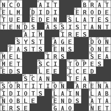ACROSS 1. Non-commissioned officer (abbr.) 4. Small island 7. Naughty child 11. Shade tree 12. "You Light Up My Life" star Conn 13. Wear away 14. Third day of the wk. 15. Genesis locale 16. Chalkboards 17. Watches over 19. Helper 21. Direct toward a target or goal 23. Angers 24. System (abbr.) 25. Grow older 26. Spanish title 29. Goes without food and/or water 30. Followers of ems 31. Single 32. Cartoonist voice _ Blanc 33. Big collection agency 34. Ocean 35. Was introduced to 36. _-fi 37. Drinks excessively 40. Begley and Asner 41. Area sheltered from the wind 42. On the rocks 43. Examine minutely or intensely 45. Beverage made from leaves 46. Making a chance decision by using lots 51. Sports stadium 55. Foolish or stupid persons 56. (Had) reclined 58. Experiment locale 59. Having high moral qualities 60. Extremities 61. "One Day ___ Time" 62. Celtic language 63. E Mali city 64. Fish or hair follower DOWN 1. Remaining after all deductions 2. A slight indication 3. Presage 4. Help 5. It may be bright or harebrained 6. Canisters 7. Naughty children 8. Round or rotation of duties 9. An important port of Yemen 10. Trial 12. Cease 13. Otherwise 16. Begets 18. 24-hour periods 20. Attaches a signature 22. Mountains (abbr.) 24. Table seasonings 25. Nest on high 26. Administered medicine 27. Washington bills 28. Teachers' org. 29. Nourish 32. Madame (abbr.) 33. Ancient Celtic tribe of eastern Britain 36. Narrow boards 37. Teat (slang) 38. Seas 39. Lightbulb-shaped fruit 43. Took without asking 44. Quote 46. Trig term 47. Aroma 48. Chest bones 49. Cassini of fashion 50. Grandmother 52. Enthusiasm 53. Nathan's nickname 54. Blind as ____ 57. Wedding promise