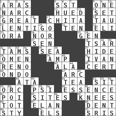 ACROSS 1. Caspian sea tributary 5. Fast jet (abbr.) 8. Single 11. Drug cop 12. Became colored 14. Put into a specified state 15. Relatively large 17. Riviera of "Kiss of the Spider Woman" 18. The 19th letter of the Greek alphabet 19. Small, flat, pigmented spot on the skin 21. Nine, plus one 22. Biblical high priest 23. Mouth or opening 24. And not 25. Commissioned mil. rank 27. Elected rep. 28. Russian ruler of old 31. Scottish caps 35. Ocean 37. Flintstone garb 38. Presage 39. Electrical Unit 41. "Terrible" tsar 42. Western Nevada city 43. According to 45. Certainty 46. Southwest Nigerian state 47. Curve 49. "One Day ___ Time" 51. Afternoon social gathering 52. Be seated 55. The grampus (Milton) 57. 23rd letter of the Greek alphabet 60. Center 62. Luau course 63. Locates 65. Leg joints 66. Small child 67. Flair 68. Scratch 69. Filthy place 70. Raised railways 71. Indian titles of respect DOWN 1. White American of non-Hispanic descent 2. Less widely known 3. Sports stadium 4. Scram! 5. Quiet! 6. Set of matching outer garments 7. Wig 8. Clearly or manifestly demonstrative 9. Be tempered by heat 10. Needle case 13. Mild oath, euphamism for damn 16. Canisters 17. Pupil covering 20. Travels 26. Principle of right and wrong 29. The sixth month of the Jewish calendar 30. Monthly bill 31. "Corrida" creature 32. So be it 33. Ananias' fault 34. Snob 36. Nursemaid (var.) 40. Food holders 44. Ancient Greek god of war 48. Keg 50. Domed church section 52. Scornful expression 53. Ancient Celtic tribe of eastern Britain 54. Trials 55. Elects 56. Carrot, for example 58. Filth; sediment 59. Slanted text style (abbr.) 61. Conclusions 64. Followers of ems