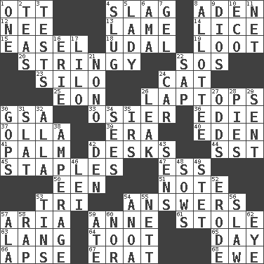 ACROSS 1. Baseball player Mel 4. Volcanic refuse 8. Arabian gulf 12. Born 13. Unable to walk 14. Louse (plural) 15. Artist's stand 18. Hereditary estate 19. Plunder 20. Slender, wiry 22. Mayday 23. Grain storage tower 24. Domesticated feline 25. Period of immesurable duration 26. Portable computers 30. Girls' org. (abbr.) 33. Flexible twig of a willow tree 36. Singer Brickell 37. Water jar 39. Epoch 40. Paradise 41. Inside of hand 42. Writing tables 44. Fast jet (abbr.) 45. Paper fasteners 47. Curvy letter 50. Car or cant ending 51. Short letter 53. Three (prefix) 54. Replies (to) 57. Roberta Peters solo 59. Singer Murray 61. Fur scarf 63. Austrian-born American filmmaker Fritz 64. A blast of a horn 65. 24 hours 66. Domed church section 67. Part of Q.E.F. 68. She-sheep DOWN 1. Single 2. Beverages made from leaves 3. Trials 4. Snaillike creature with no shell 5. Kenny Rogers chart-topper in '80 6. Nursemaid (var.) 7. Set 8. One to whom something is allotted 9. "Vaya con ____" 10. Environmental prefix 11. Fish or hair follower 16. One of the Great Lakes 17. _ and Stitch 21. Words to Nanette 22. Plant excrement 24. 4-wheeled motor vehicle 26. Path through which fluid escapes 27. Likelihood 28. Sliced desserts 29. Posted 30. Republicans 31. Narrow board 32. Silent film actress Nazimova 34. Observes 35. Big collection agency 38. Electrical Measurement 42. Lair 43. Elected reps. 46. Flowery wreath 48. Sty mamas 49. Proofreading order 52. Eat (away) 53. Metal containers 54. Small Philippine buffalo 55. Remaining after all deductions 56. Cole _ (cabbage dish) 57. Wing 58. Hit sharply and swiftly 59. Had dinner 60. Or not 62. Sight organ