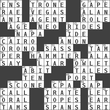 ACROSS 1. Followers of ems 4. Marketplace scale 9. Open wide 13. Actress Charlotte 14. Viva Las _ 15. Actor Alda or Thicke 16. Black tropical American cuckoo 17. Representative 18. Hero or heavy, e.g. 19. Personal question 21. Modern: prefix 22. Amusement-park features 24. California wine valley 26. Binary compound 27. Capital of Egypt 29. Soon (poet.) 30. U. of Maine site 31. Backtalk 33. Scottish cap 36. For each 37. More given to overacting 40. Wing 41. Declare 42. One who doesn't tell the truth 43. A small or young owl 45. "This won't hurt ____!" 47. Falsehoods 48. Nine, plus one 49. Left side of a ship or aircraft 50. Biscuitlike quick bread 52. Numbers guy (abbr.) 54. Plant excrement 56. Give a ring to 57. Feeling or showing extreme anger 59. Allow 61. Taken by mouth 62. Drinks excessively 63. Ewer handle 64. Scottish caps 65. Connects, as a bridge 66. Indian title of respect (Mr.) DOWN 1. Epoch 2. Nanny 3. Signiory (variant) 4. Federal power corp. 5. Canadian anthropologist Darnell 6. Double curve, resembling the letter S 7. Billionth: prefix 8. Eastern Standard Time (abbr.) 9. Place where plants grow 10. Medicinal plant 11. Friends 12. Compass dir. 20. Merit 22. Wash lightly 23. Wedding promise 25. "Silly old bear" 27. 911 reaches them 28. Type of rug 29. SW Saudi Arabia district 31. Stricken, poetically 32. Housemaid (var.) 33. Baron Munchausen's specialties 34. Toward shelter 35. Floor coverings 38. Place in a line 39. Printing process, for short 44. Armed conflicts 45. Ringlike coral islands and reefs 46. Benjamin's nick name 49. Eucharist need 50. "Two Mules for Sister ____" 51. Burrowing marine mollusk 52. Riding implement 53. Dad 55. Lightbulb-shaped fruit 56. Small bed 57. It is 58. Curvy letter 60. Three (prefix)