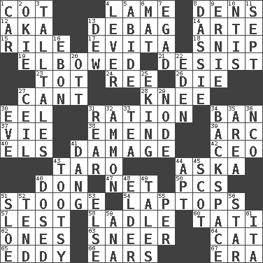 ACROSS 1. Small bed 4. Unable to walk 8. Habitations of wild animals 12. Alias (abbr.) 13. Debunk (Brit. slang) 14. Johnson of "Laugh-In" 15. Cause heat under the collar 17. Webber/Rice musical 18. Sever or remove by pinching or nipping 19. Turned at an angle; bent 21. Stop 23. Small child 24. To riddle 26. Expire 27. Patter 28. Leg joint 30. Snakelike fish 31. Food allowance for one day 34. Prohibit 37. Compete 38. Make improvements or corrections to 39. Curve 40. Raised railways 41. Break 42. Corporate head (abbr.) 43. Edible starchy tuberous root 44. "____ silly question..." 46. Spanish title 47. Fish or hair follower 50. Personal Computers (abbr.) 51. Moe Howard, for one 54. Portable computers 57. For fear that 58. Dipping utensil 60. Jacques of French films 62. Singles 63. Contemptuous expression 64. Domesticated feline 65. Whirlpool 66. Hearing organs 67. Epoch DOWN 1. Automobile 2. Migrant worker of the '30s 3. Baron Munchausen's specialties 4. Crowbar 5. Remain 6. Floor protector 7. Mild oath 8. Small ungulate mammals of Africa 9. Bert's buddy 10. Nuclear Threat Initiatives 11. Back-to-school mo. 13. Morning condensation 16. Inky black, to poets 20. Baseball player Mel 22. Paradise 25. Supplementing with great effort 27. To provide with a ceiling 29. Thickened enlargement 30. Night before a holiday 31. Hitchcock's "____ Window" 32. ID or VA city 33. Afternoon social gathering 34. Keyboard key 35. Type of rug 36. Non-commissioned officer (abbr.) 41. Mild oath, euphamism for damn 43. Tootsie (variant) 44. Fitting 45. Highlander 46. Administered medicine 48. A person who is older than you are 49. Lies 51. A type of plum 52. Be inclined (to) 53. Otherwise 55. For each 56. Play the lead 59. Santa ___, CA 61. Call ___ day