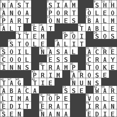 ACROSS 1. Political cartoonist Thomas 5. Thailand, formerly 9. Quiet! 12. Small Philippine buffalo 13. Left side of a ship or aircraft 14. Margarine 15. Piece 16. Washington bills 17. Lip ointment 18. The first octave above the treble staff 19. Consume 21. Eating place 22. A distinct part 24. Luau course 26. Mayday 27. Fur scarf 28. Set down 29. Earth 30. Relating to the nose 32. Measure of real estate 36. Calm and collected 37. Curvy letter 38. Supercomputer manufacturer 39. Taverns 40. _____ steamer (cargo ship) 42. Casino tip 43. Demure 44. Came up 46. Label 49. Standoff 50. Religious women 51. Phillipine bananalike plant 53. Compass dir. 54. Armed conflict 57. Pale green bean 58. Drink excessively 61. Grand slam 62. Prepare for publication 63. Part of Q.E.F. 64. SW Asia republic 65. Elected rep. 66. Grandmother 67. Singer Brickell DOWN 1. California wine valley 2. Of or related to the anus 3. Drawing lots 4. Make lace 5. Specific locale 6. Electrically charged atom 7. "We ___ not amused" (Victoria) 8. Mountains (abbr.) 9. Broad, flat, thick pieces 10. Phone greeting 11. Residences 14. Chief or king in Benin or Nigeria 19. Snakelike fish 20. So be it 21. Teat (slang) 23. For Whom the Bell _____ 24. Suffix with ecto or cyto 25. Petroleum 27. Within a short period 28. Indian state 29. _-fi 31. Nest on high 32. NE Massachussets city 33. What you're doing now 34. Libertine 35. Sight organ 40. Three (prefix) 41. Baking dishes 43. Parent Teacher Association (abbr.) 45. Sorrow 46. Falsehoods 47. Tolerate 48. Street urchin 52. Domesticated feline 53. Bristle 55. Jai _ 56. French philosopher Descartes 58. "___ Little Indians" 59. Mouth or opening 60. Baking dish 61. Compete