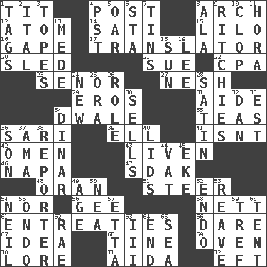 ACROSS 1. Teat (slang) 4. Mail 8. Bowlike part 12. Tiny particle 14. Suttee (variant) 15. _ and Stitch 16. Open wide 17. Interpreter 20. Downhill vehicle 21. Institute legal proceedings 22. Numbers guy (abbr.) 23. Sir (Sp.) 27. Soft 29. Greek god of love 31. Assistant 34. A sleeping potion; an opiate (poet.) 35. Afternoon social gatherings 36. Indian skirt 39. Pipe bend 41. Is not 42. Sign of things to come 43. Make or become more lively 46. California wine valley 47. Neighbor of Neb. 48. NW Algerian seaport 51. Bull 54. Not either 56. Unit of force equal to gravity 58. Remaining after all deductions 61. Pleas 66. Have the gumption 67. The main thing one is thinking about 68. Prong on a fork 69. Baking chamber 70. Old wives' tales, e.g. 71. Opera by Verdi 72. Lizard (obsolete) DOWN 1. Labels 2. Slanted text style (abbr.) 3. Drinks excessively 4. Pacific Standard Time (abbr.) 5. Boat paddle 6. R.R. building 7. Airtight sealed metal containers 8. Wing 9. Actors Guy, Robert Welles, and Clint 10. Hoof sound 11. Israeli folk dance 13. Ancient Persian 18. Player for Phoenix 19. Area sheltered from the wind 24. ___ Haven, CT 25. Mouth or opening 26. Hero or heavy, e.g. 28. Smooth fabric 30. Makes a sale 32. Daniel's nick name 33. Eastern Standard Time (abbr.) 34. Middle Eastern gold or silver currency 36. Male child 37. Nursemaid (var.) 38. News announcer 40. Flaplike coverings 44. Large container 45. Supplement with great effort 49. Grow older 50. Teachers' org. 52. Inside; within (prefix) 53. Rob, plunder, or pillage 54. Famous astronaut Armstrong 55. Southwest Nigerian state 57. Singer James 59. Unclean, religiously 60. Portable shelter 62. Actress Charlotte 63. One more than two 64. Conclude 65. Ocean