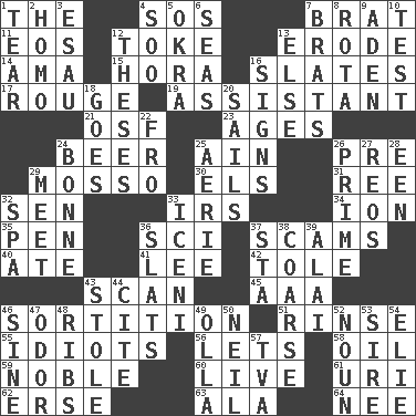 ACROSS 1. Definite Article 4. Mayday 7. Naughty child 11. Greek goddess of the dawn 12. Puff or smoke 13. Eat (away) 14. Nanny (var.) 15. Israeli folk dance 16. Chalkboards 17. Makeup applied to the cheeks 19. Helper 21. Order of Saint Francis (abbr.) 23. Grows older 24. Fermented drink made from hops 25. The 18th letter of the Arabic alphabet 26. Before (prefix) 29. With motion or animation 30. Raised railways 31. Portuguese money of account (variant) 32. Elected rep. 33. Big collection agency 34. Electrically charged atom 35. Fenced enclosure 36. _-fi 37. Fraudulent business schemes 40. Had dinner 41. Area sheltered from the wind 42. Lacquered or enameled metalware 43. Glance over 45. Auto club (abbr.) 46. Making a chance decision by using lots 51. Remove soap 55. Foolish or stupid persons 56. Allows 58. Lubricate 59. Having high moral qualities 60. Not recorded 61. RI univ. 62. Celtic language 63. Insect wing 64. Born DOWN 1. Separate forcefully 2. Like (prefix) 3. He sold his birthright 4. "Barney Miller" actor Jack 5. Gumbo ingredient 6. Oceans 7. Naughty children 8. Round or rotation of duties 9. An important port of Yemen 10. Trial 12. College papers 13. Otherwise 16. Omens 18. Leaves 20. Moves on water 22. Back 24. Child's nurse 25. Nest on high 26. First class 27. Vintage cars 28. Car or cant ending 29. Rendezvous 32. Health resort 33. Ancient Celtic tribe of eastern Britain 36. Narrow boards 37. R.R. building 38. Unrefined 39. Jai _ 43. Took without asking 44. Quote 46. Trig term 47. Aroma 48. Chest bones 49. Water jar 50. Famous astronaut Armstrong 52. Part of speech 53. Title for a man of rank and authority 54. Writer Wiesel 57. Federal power corp.