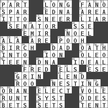 ACROSS 1. Component 5. Having great length 9. Papal veil 13. Coast Guard woman 14. Pulitzer Prize-winning author Ferber 15. Type of rug 16. "Tell ____ the Marines!" 17. Contemptuous expression 18. One who doesn't tell the truth 19. Elected representative 21. Compass dir. 22. Arab leader 23. Christmas carol 24. Insect wing 27. "We ___ not amused" (Victoria) 28. "Silly old bear" 29. A tree used for making furniture 31. June honoree 32. Pledge 36. To the inside or interior of 37. Electrically charged atom 38. Margarine 39. Adolescent 40. Heredity factor (abbr.) 41. Standard of perfection 42. Flintstone 44. Raised railways 46. Compass dir. 47. Broad smile 48. Grant temporary use of 50. Friend of Pooh 51. Snuggling 54. Northwest Algerian city 56. Voters do this 58. Grand slam 60. The smallest animal of a litter 61. System (abbr.) 62. Lyric poems 63. Wagers 64. Arranges properly for use 65. Portable shelter DOWN 1. Air pressure measure (abbr.) 2. Flats, for short 3. Assign a rank or rating to 4. Heavy duty weighing machine 5. Poe poem 6. River in Europe 7. Compass dir. 8. Slender fish 9. It jiggles the polygraph 10. Satellite of Uranus 11. Teachers' org. 12. Rowing implement 17. Use a spoon 20. Housemaid 21. "Barney Miller" actor Jack 23. Dreamland 24. "This won't hurt ____!" 25. Actor's bit 26. Johnson of "Laugh-In" 28. Baking dish 30. Meets 31. ___ good deed 33. Toward shelter 34. Afternoon social gatherings 35. Opening into or through something 37. Indiana (abbr.) 40. Lair 41. Is not 43. River (Sp.) 44. Chooses 45. For fear that 47. Monetary aid 49. A piece of turf (Scot.) 51. Egg locale 52. Connecting point 53. Small, secluded valley 54. Globe 55. Sorrow 56. Double-curved letter 57. Potassium hydroxide 59. Eastern Standard Time (abbr.)