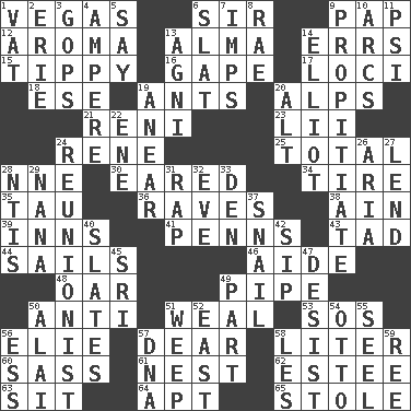ACROSS 1. Viva Las _ 6. Title for a knight 9. Infant food 12. Odor 13. _ mater 14. Blunders 15. Likely to tip or tilt 16. Stare wonderingly 17. Event scenes 18. Compass dir. 19. Pismires 20. High mountains 21. Painter Guido (1575-1642) 23. Cards in a Roman deck? 24. French philosopher Descartes 25. Add up to 28. Compass dir. 30. Having ears or earlike features 34. Become fatigued 35. The 19th letter of the Greek alphabet 36. All-night dance parties 38. The 18th letter of the Arabic alphabet 39. Lodging establishments 41. Actor Sean's family 43. Small amount or degree 44. Travel by water 46. Assistant 48. Boat paddle 49. Corncob 50. Against 51. Welt 53. Distress signal 56. Writer Wiesel 57. Letter starter 58. 61 cubic inches 60. Backtalk 61. Egg locale 62. First name in cosmetics 63. Be seated 64. Fitting 65. Took without asking DOWN 1. Large container 2. One of the Great Lakes 3. Republicans 4. Electrical Unit 5. Declare 6. Narrow board 7. Naughty children 8. Actress Charlotte 9. Appease 10. Curves 11. 23rd letter of the Greek alphabet 13. Hindu god of fire 14. American author Paul (1891-1958) 19. Approach 20. Keyboard modifier key 22. Compass dir. 24. One who advocates reunion 26. Roberta Peters solo 27. Grant temporary use of 28. Nuclear Threat Initiatives 29. Nanny 31. Hit sharply and swiftly 32. First lady 33. Lair 37. Slow-paced one 40. Chalkboards 42. Small drink 45. Indian title of respect (Mr.) 47. Cease 49. Component 50. Mountain range southwest of Kyrgyzstan 51. Shed a tear 52. Compass direction 54. Von Bismarck 55. Stitch closed the eyes of (a falcon) 56. Curvy letter 57. Heredity factor (abbr.) 58. French article 59. To riddle